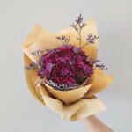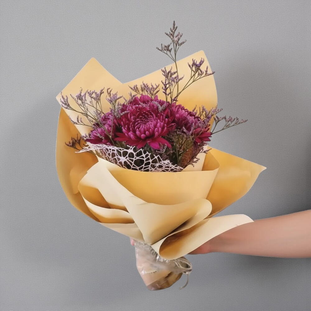 This exquisite bouquet is a captivating blend of elegance and charm, featuring deep purple chrysanthemums surrounded by delicate dried statice flowers. Wrapped in luxurious golden paper, it exudes sophistication and warmth, making it a perfect gift for special occasions or as a stunning home decor piece. The vibrant hues of the chrysanthemums symbolize joy and longevity, while the delicate fillers add a touch of rustic beauty. The bouquets intricate net wrapping enhances its artistic appeal, giving it a unique and refined look. Whether youre celebrating a birthday, anniversary, or simply want to brighten someones day, this bouquet is sure to leave a lasting impression. To keep it fresh, trim the stems at an angle and place the bouquet in clean water, changing it every two days. Keep away from direct sunlight and drafts for prolonged freshness.