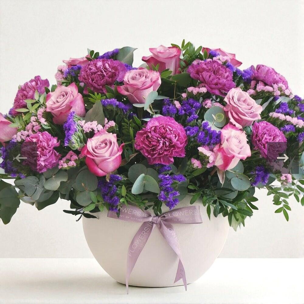 This luxurious floral arrangement brings together the enchanting charm of lavender and deep purple hues, creating a romantic and sophisticated centerpiece. Nestled in an elegant matte ceramic vase, the bouquet features blooming roses, lush carnations, and vibrant statice, accented with delicate pink fillers. Rich greenery adds depth and contrast, enhancing the beauty of each flower. To prolong freshness, place the bouquet in a cool room away from direct sunlight and drafts. Mist the flowers lightly every 1–2 days and trim the stems if transferred to another vase with water. Ideal for those special moments like birthdays, anniversaries, or any heartfelt occasion, this flower bouquet transcends the ordinary and becomes a tangible manifestation of love. Send it as a birthday gift, express anniversary wishes, convey get well soon sentiments, or simply wish a loving moment to someone dear. Anniversary, Birthday, Iam Sorry, New Baby, Suits any Occasion, Thank You, Wedding