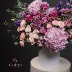 rose Deep purple - 7 pcs hydrangea pink - 3 pcs eustoma purple - 3 pcs wax pink - 5 pcs santini purple - 4 pcs spray rose sahara - 4 pcs alstromeia pink - 5 pcs