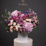 Indulge in the luxurious beauty of this unique florists special arrangement. An expertly curated mix of 3 pieces of elegant pink hydrangea, 7 exquisite deep purple roses, 3 dew-kissed purple eustomas, 4 blooming spray rose saharas, and 4 charming santini purples offering an eye-catching contrast. To add a touch of gentle refinement, weve included 5 pieces each of delicate pink alstroemerias and admirable pink wax blooms. This floral masterpiece is an express declaration of taste and sophistication, perfect to adorn any space or to express your sentiments on any occasion.