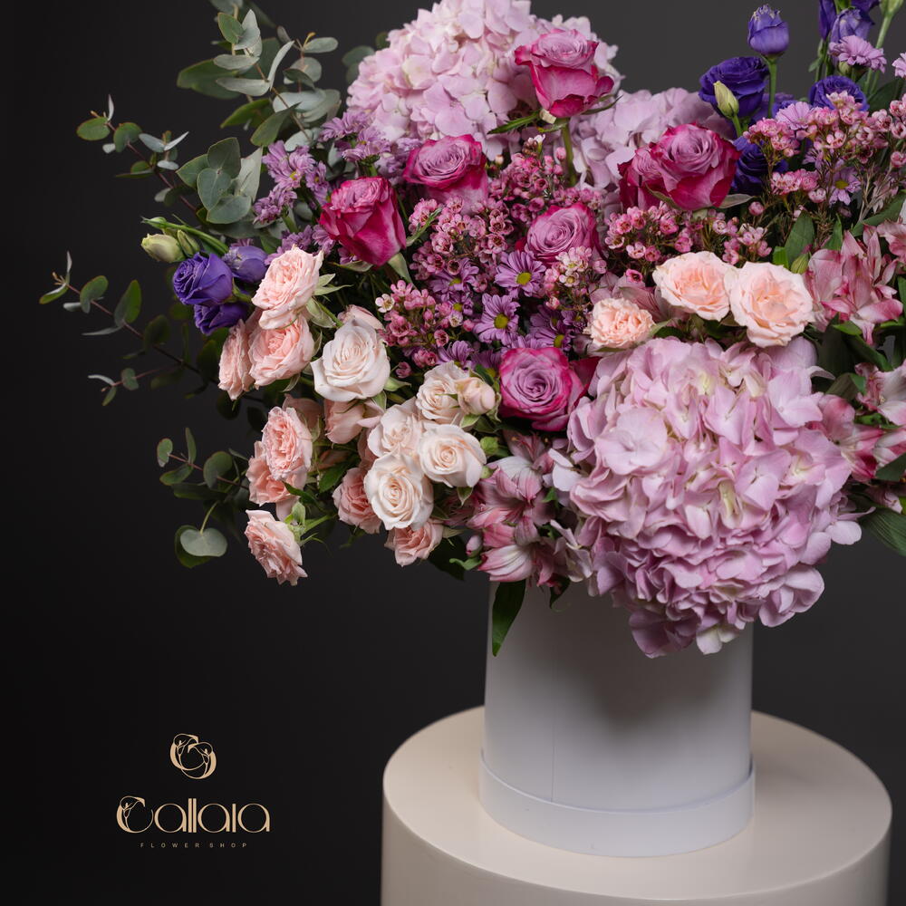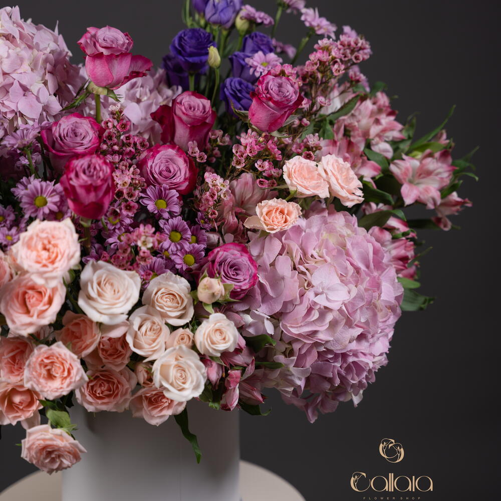 Indulge in the luxurious beauty of this unique florists special arrangement. An expertly curated mix of 3 pieces of elegant pink hydrangea, 7 exquisite deep purple roses, 3 dew-kissed purple eustomas, 4 blooming spray rose saharas, and 4 charming santini purples offering an eye-catching contrast. To add a touch of gentle refinement, weve included 5 pieces each of delicate pink alstroemerias and admirable pink wax blooms. This floral masterpiece is an express declaration of taste and sophistication, perfect to adorn any space or to express your sentiments on any occasion.
