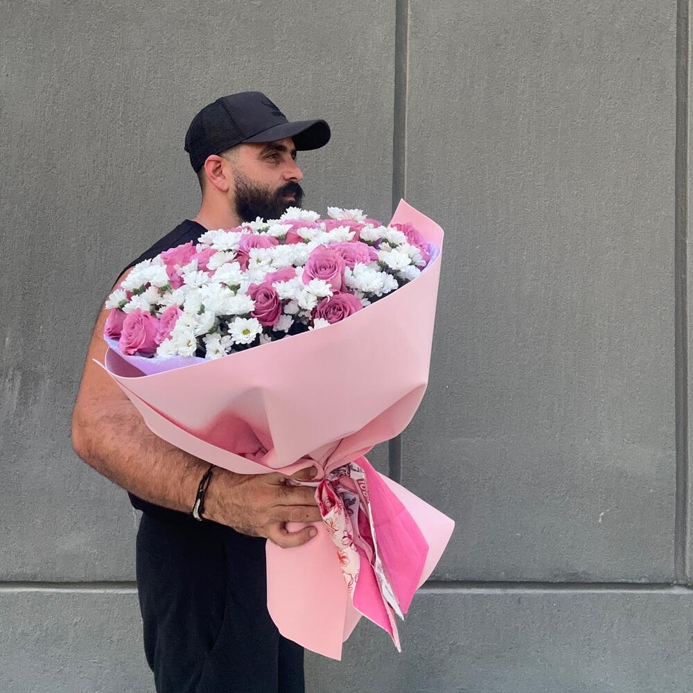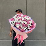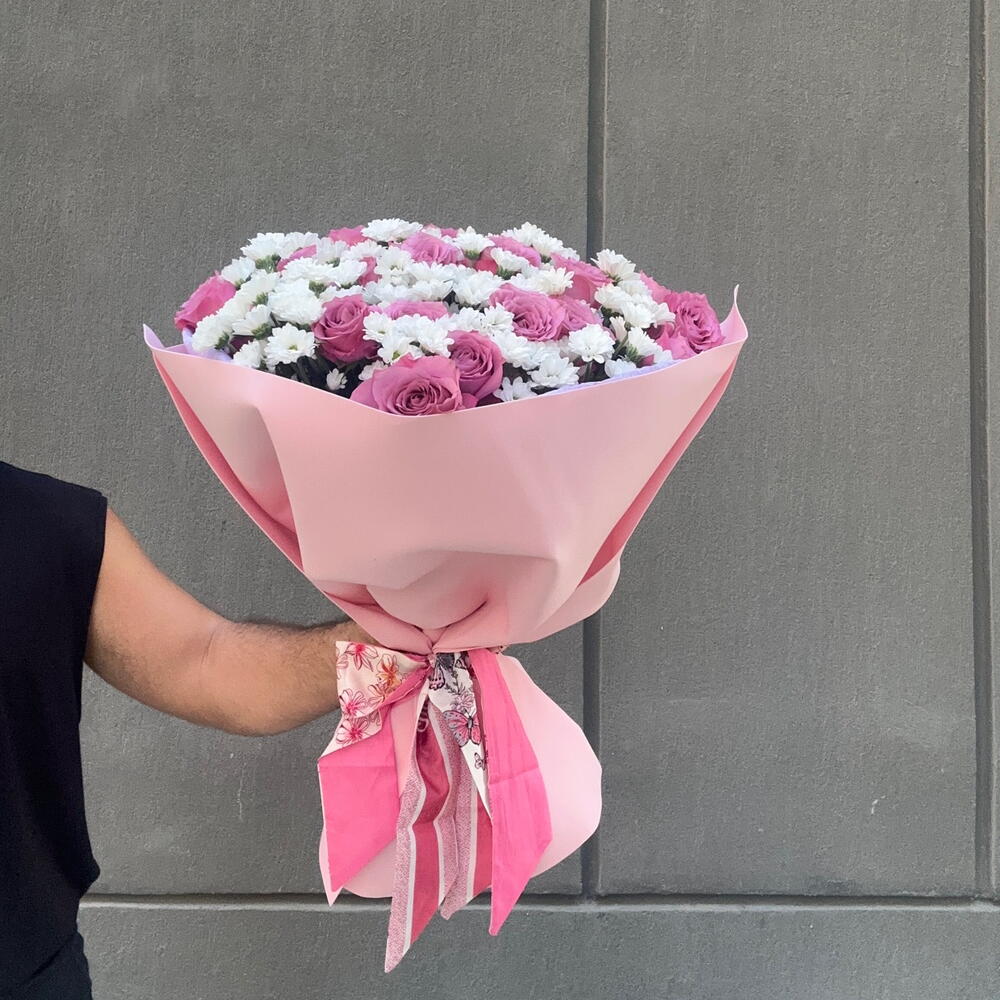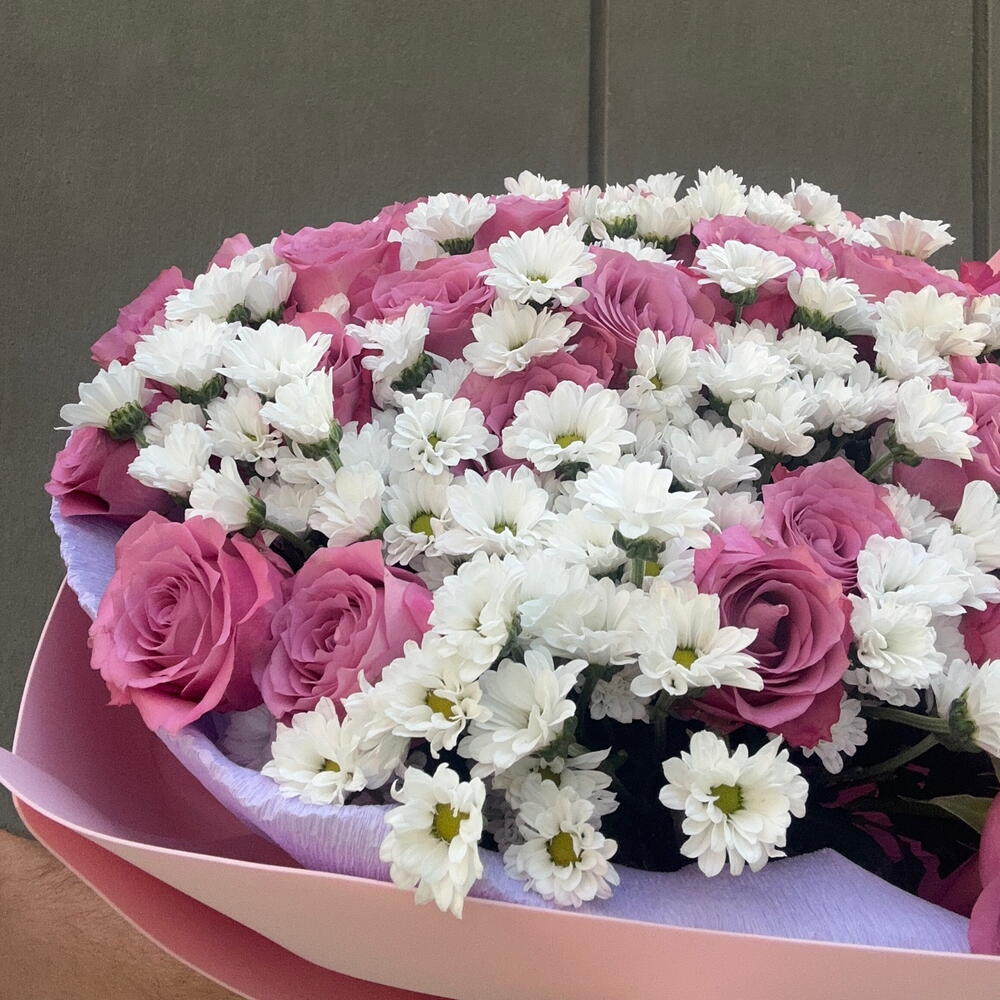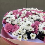 white chrysanthemum - 15 pcs purple rose - 25 pcs