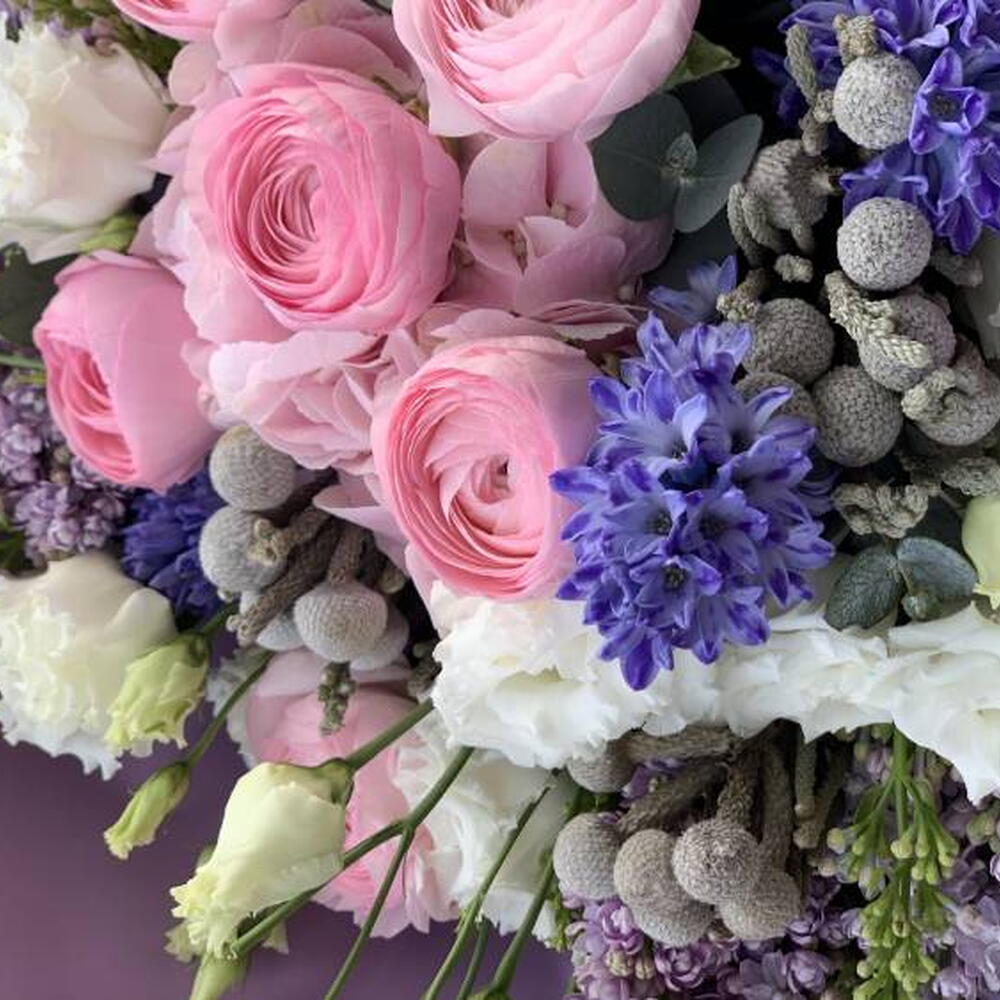 Composition: Lilac - 3, Hyacinth - 4, Ranunculus - 6, Lisianthus - 5, Brunia - 4, Eucalyptus - 2, wrapping - 6, ribbon - 1 Sizes: WIDTH - 55CM; HEIGHT - 65CM; LENGTH - 65CM; (including packaging) Size: 55 x 65 x 65 cm