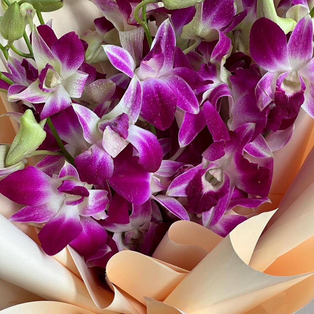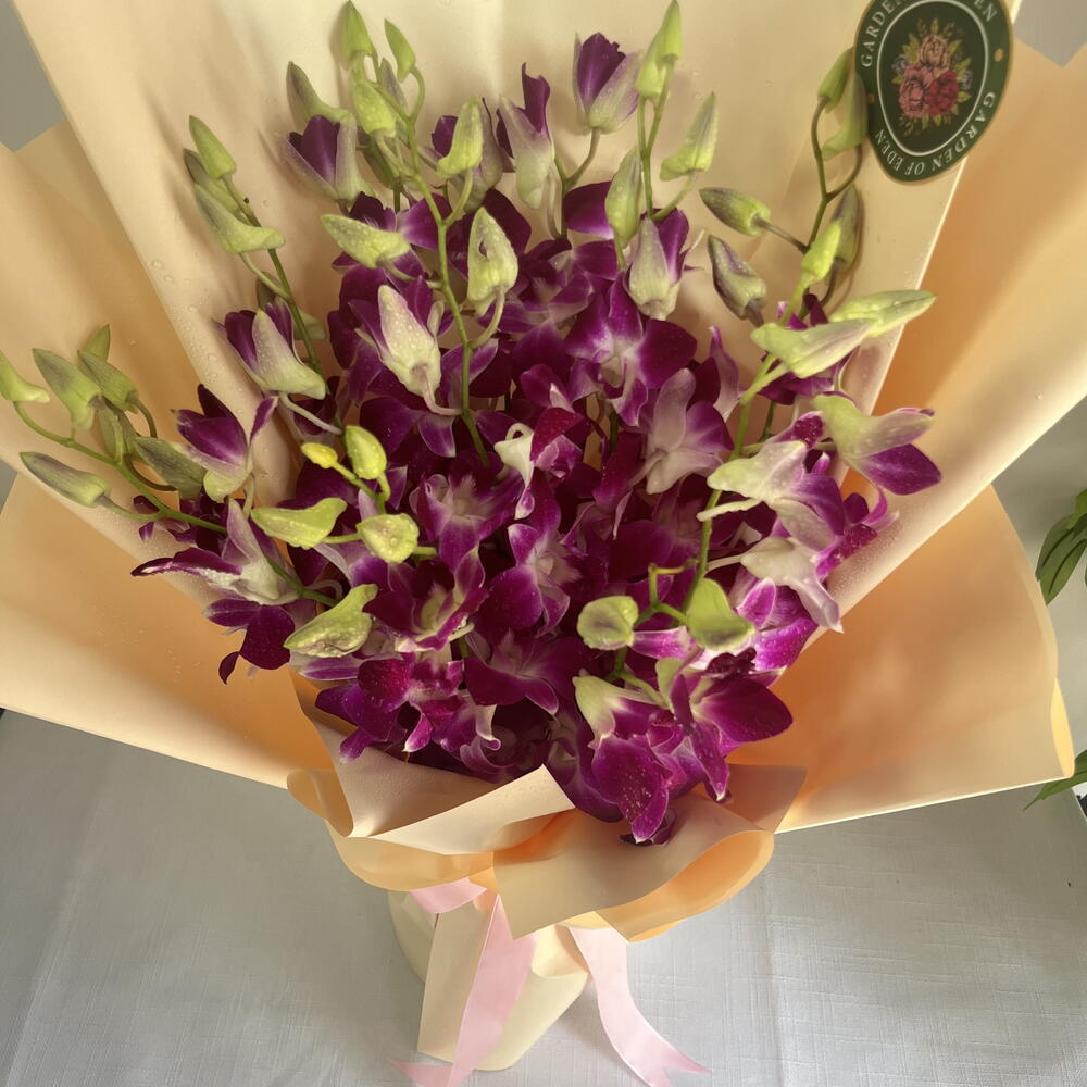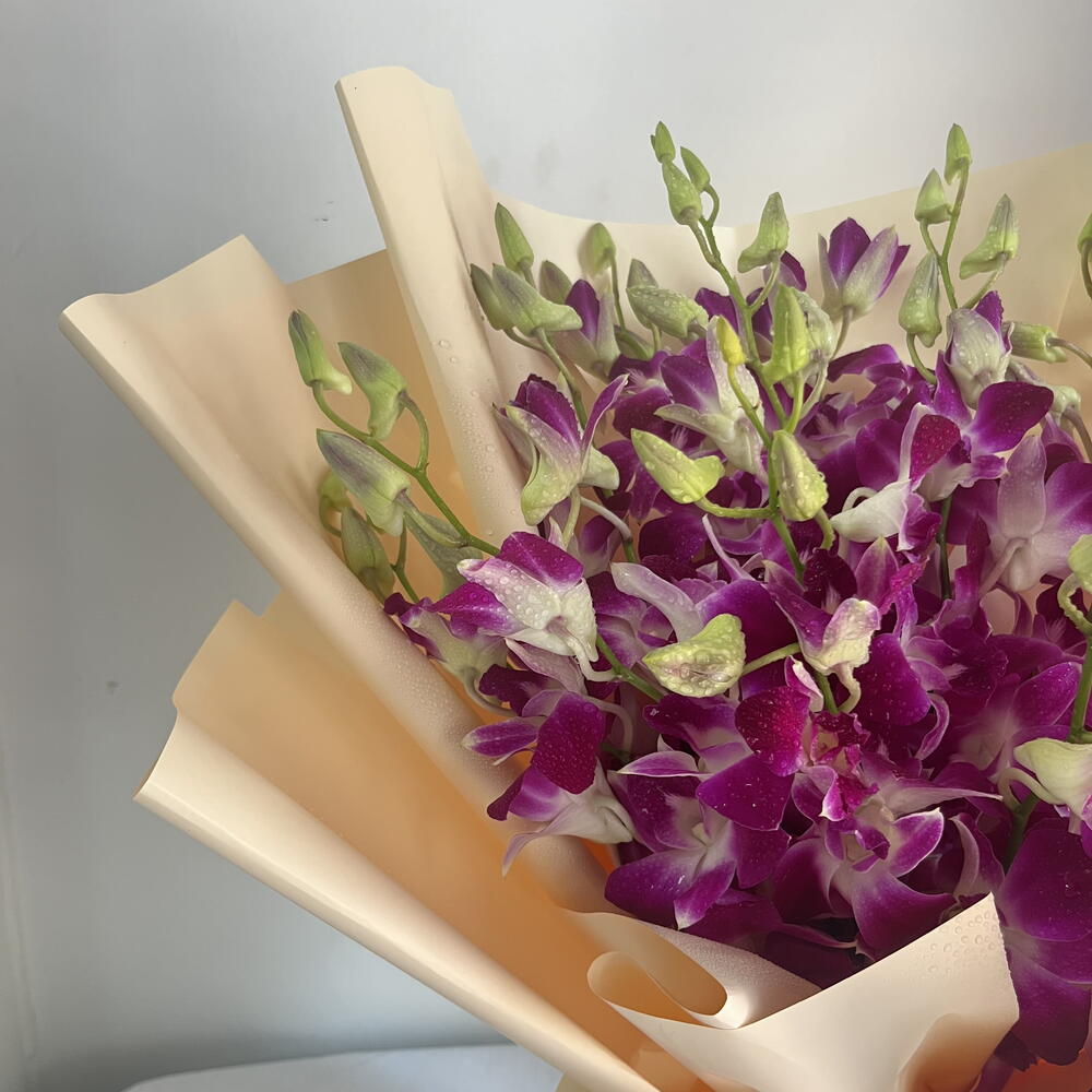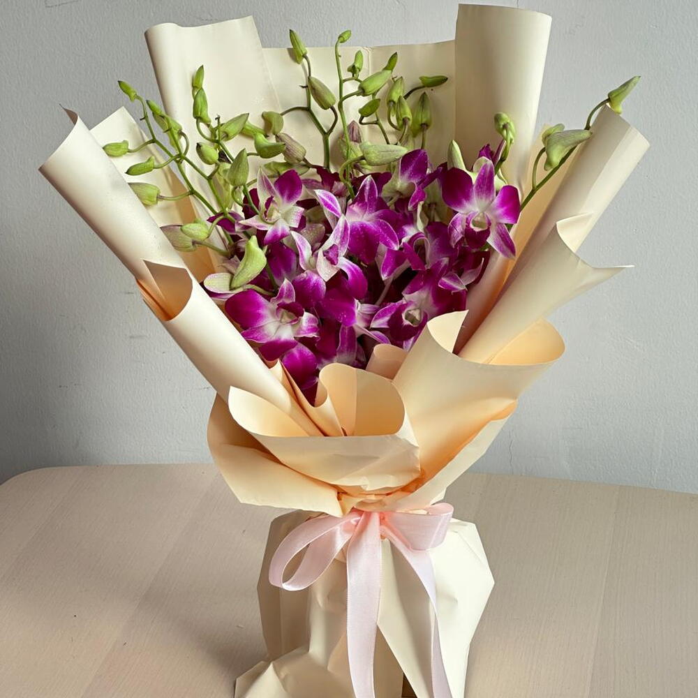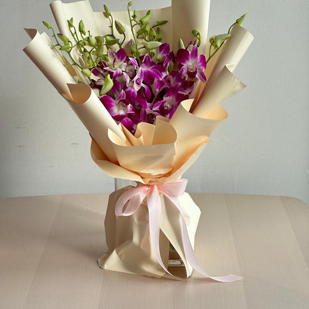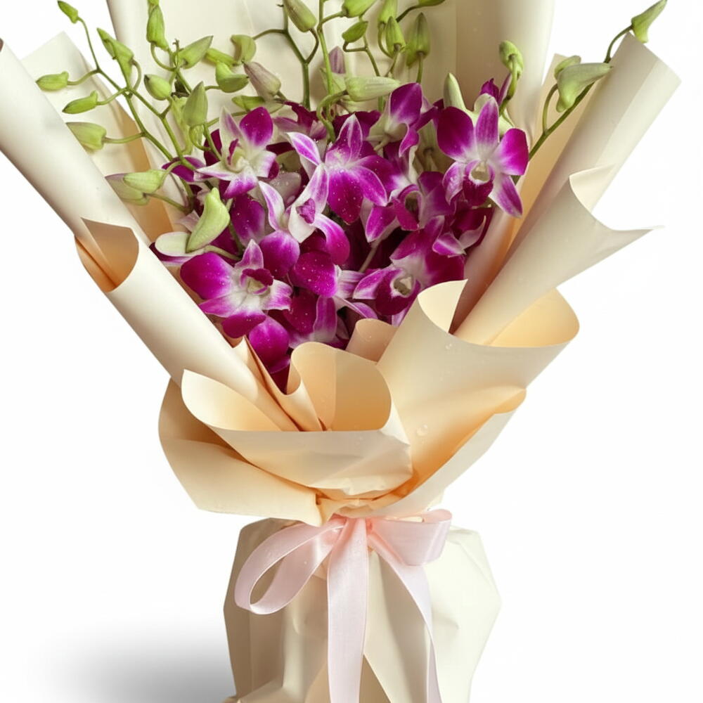 Make a lasting impression with our Royal Orchid Charm bouquet — a striking arrangement of 10 vibrant purple orchids, known for their exotic beauty, elegance, and long-lasting freshness. Delicately wrapped in soft cream and peach-toned paper and tied with a pastel ribbon, this bouquet radiates sophistication and charm—perfect for those who appreciate unique, graceful blooms. Whether youre celebrating a birthday, anniversary, or simply want to say “You’re special,” this bouquet is a timeless gesture of admiration, respect, and refined taste. Perfect for: Elegant Gifting | Corporate Appreciation | Get Well Soon | Modern Romance 📦 Order now for same-day delivery and let these radiant orchids speak for you.