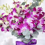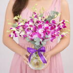A graceful expression of elegance and calm, this stunning arrangement features 11 vibrant purple orchids beautifully complemented by 2 stems of fresh eucalyptus leaves, adding natural texture and a soft, refreshing touch. Thoughtfully styled in a designer Mutka vase, the arrangement blends contemporary charm with timeless sophistication. The rich purple tones symbolize admiration and luxury, while the eucalyptus enhances depth and fullness, creating a balanced and premium floral statement. Perfect for birthdays, anniversaries, housewarmings, or upscale gifting, this arrangement brings refined beauty into any home or office space.