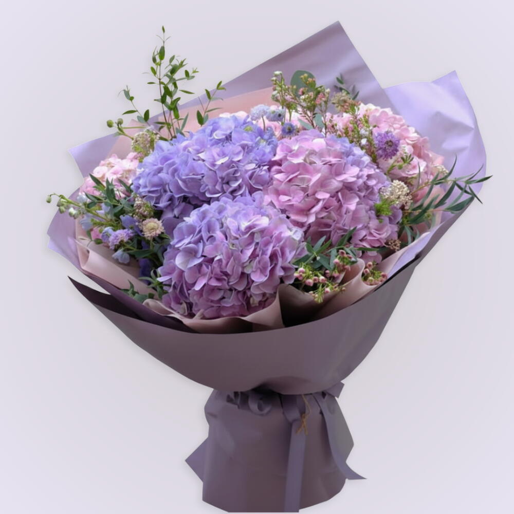 3 purple hydrangea , 3 pink hydrangea , 4 wax flowers