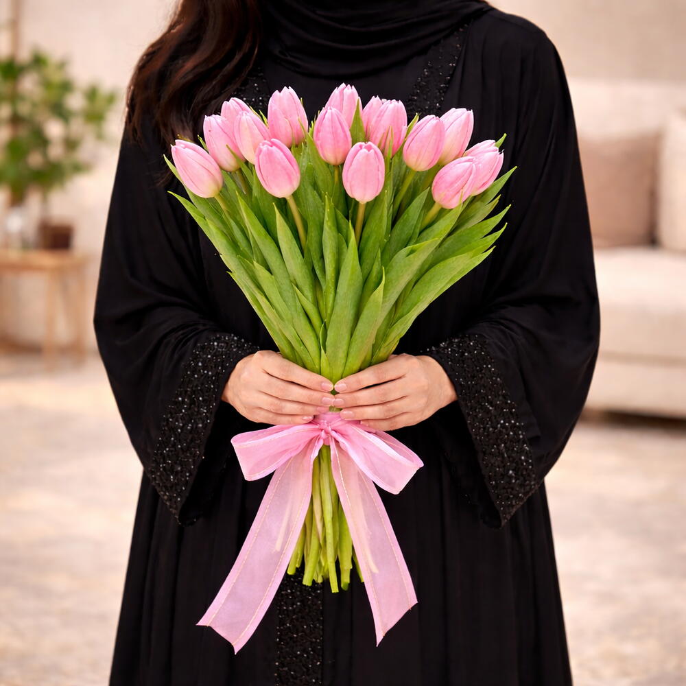 This bouquet features multiple stems of fresh pink tulips arranged in a neat, hand-tied style that highlights their natural beauty