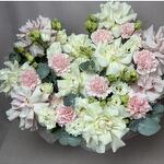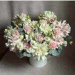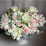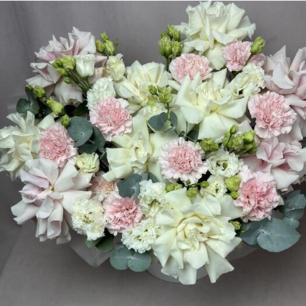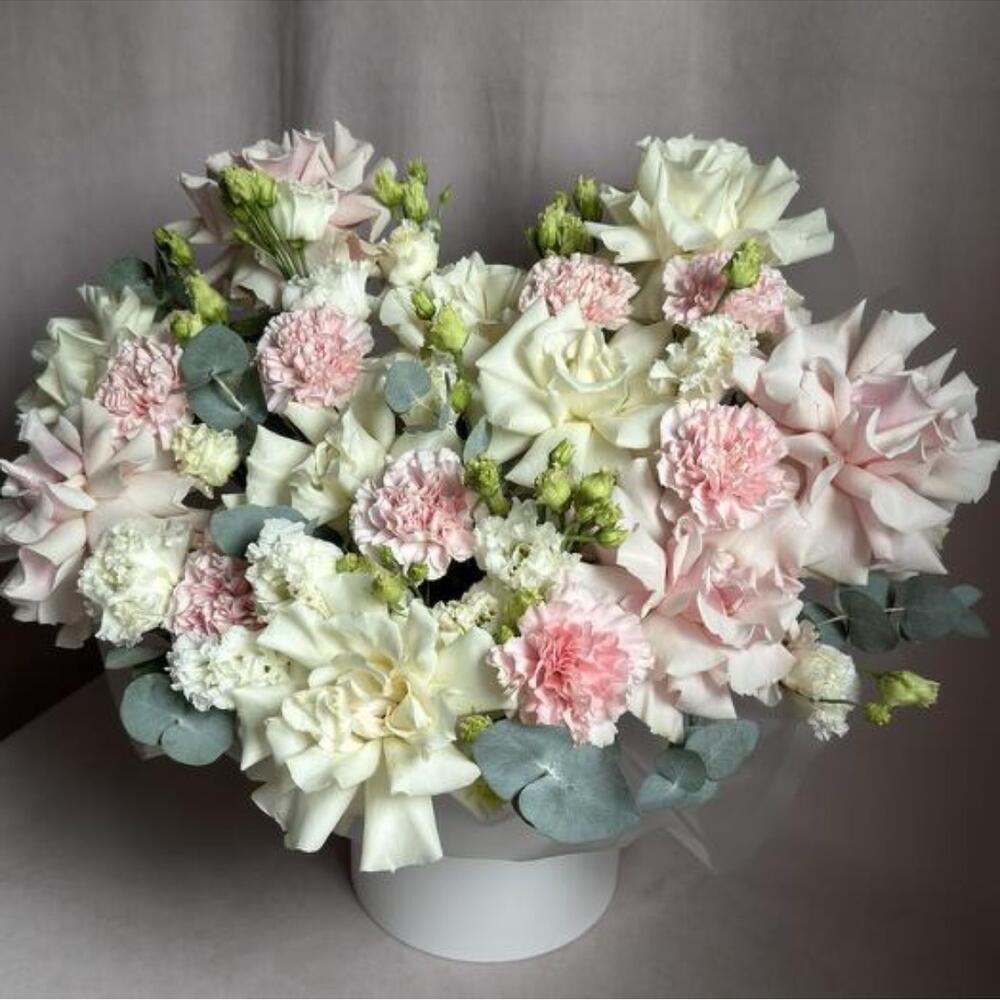 Box - 1 pcs pink carnations - 10 pcs pink mondial - 4 pcs white eustoma - 7 pcs eucalyptus leaves - 5 pcs white french roses - 6 pcs