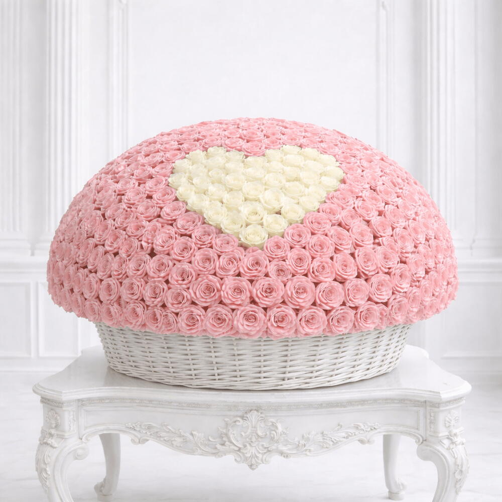 a luxurious, dome-shaped floral arrangement presented in an elegant white woven basket. The arrangement is primarily composed of numerous pink roses, which symbolize passion and romance.