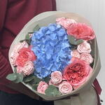 blue hydrangea - 1 pcs wrapping paper - 3 pcs bombastic spray rose - 3 pcs pink expresion garden rose - 3 pcs eulcyptus - 4 pcs