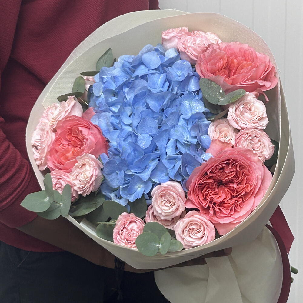 blue hydrangea - 1 pcs wrapping paper - 3 pcs bombastic spray rose - 3 pcs pink expresion garden rose - 3 pcs eulcyptus - 4 pcs