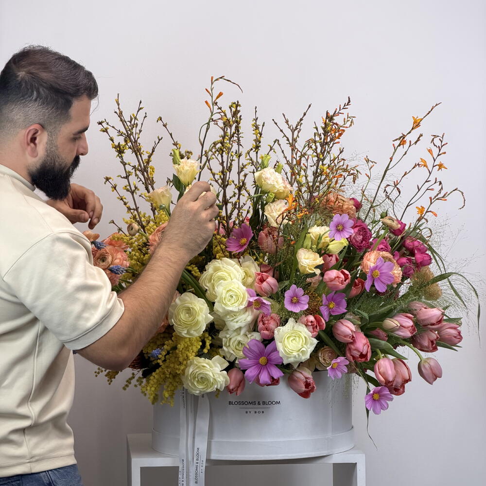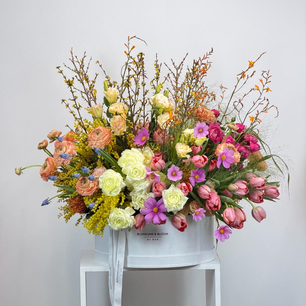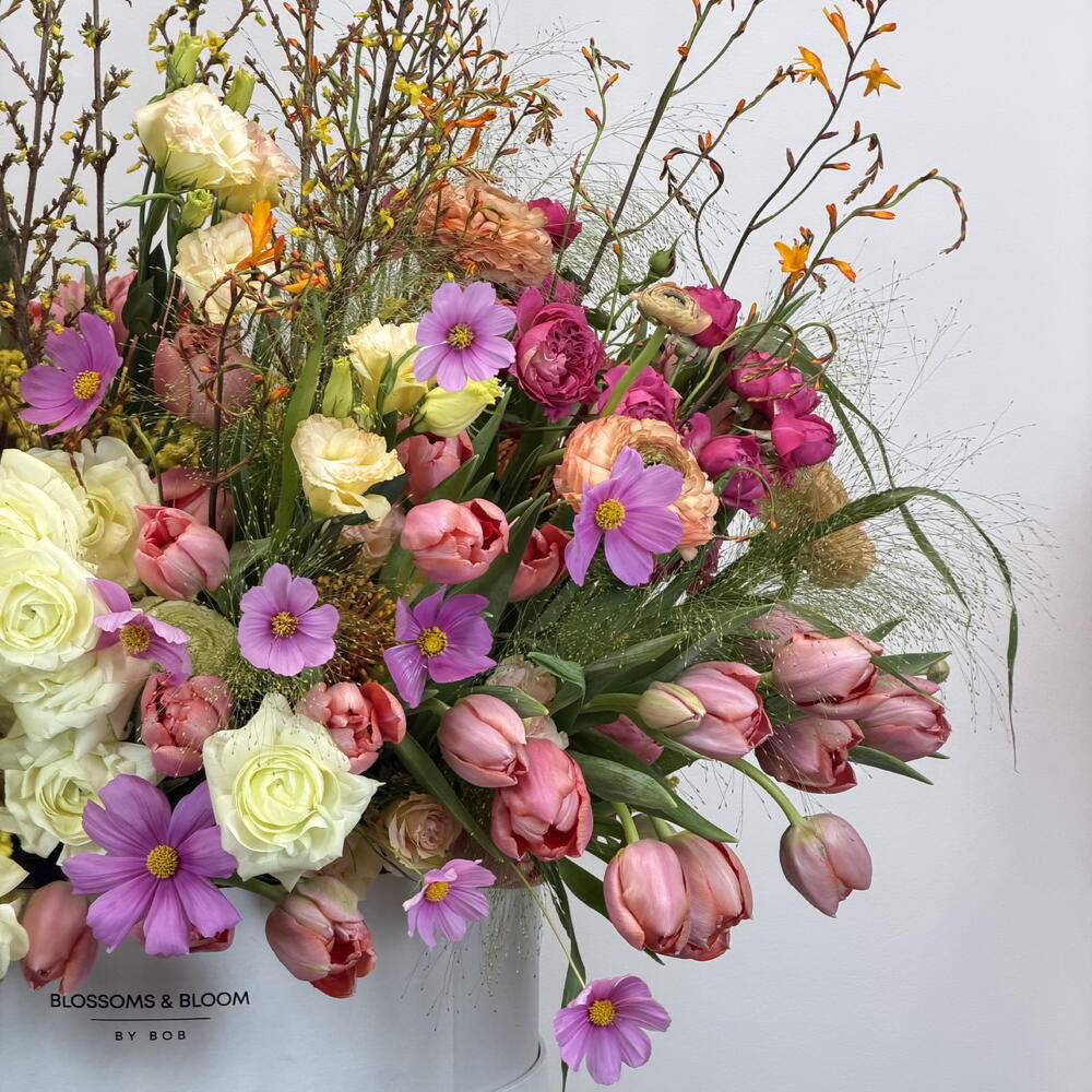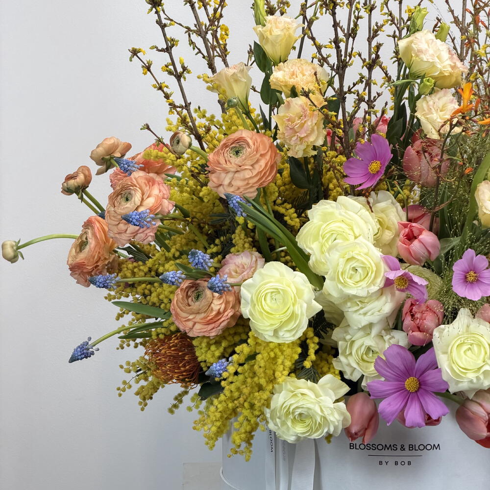Tulip - 30 pcs ranunculus - 20 pcs spray rose pink - 20 pcs pampas grass - 10 pcs large box - 1 pcs orange yellow tide bunch - 20 pcs memosa - 10 pcs spring rose’s stem - 20 pcs afrcan pink - 20 pcs spring yellow - 10 pcs