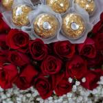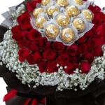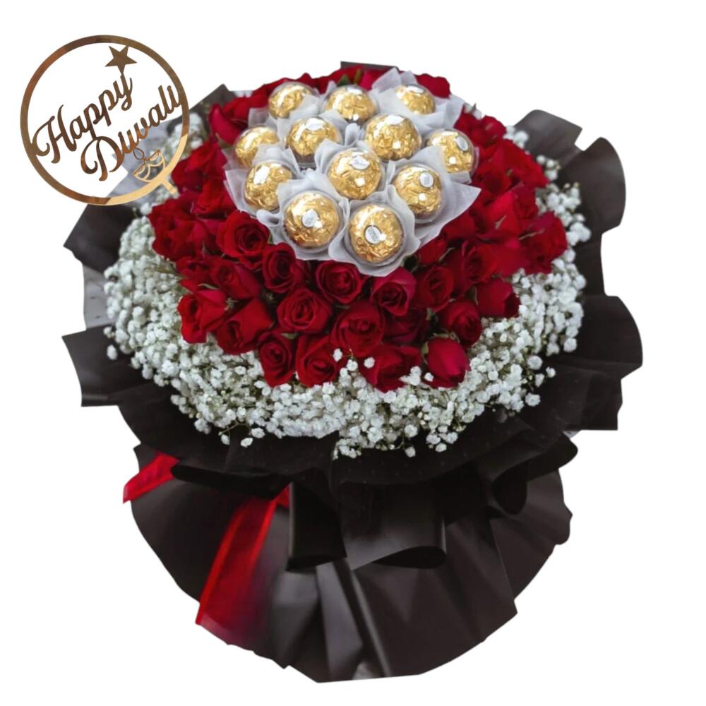 gypsophila white - 20 pcs ferrero rocher chocolate - 12 pcs red roses - 51 pcs diwali topper acrylic - 1 pcs
