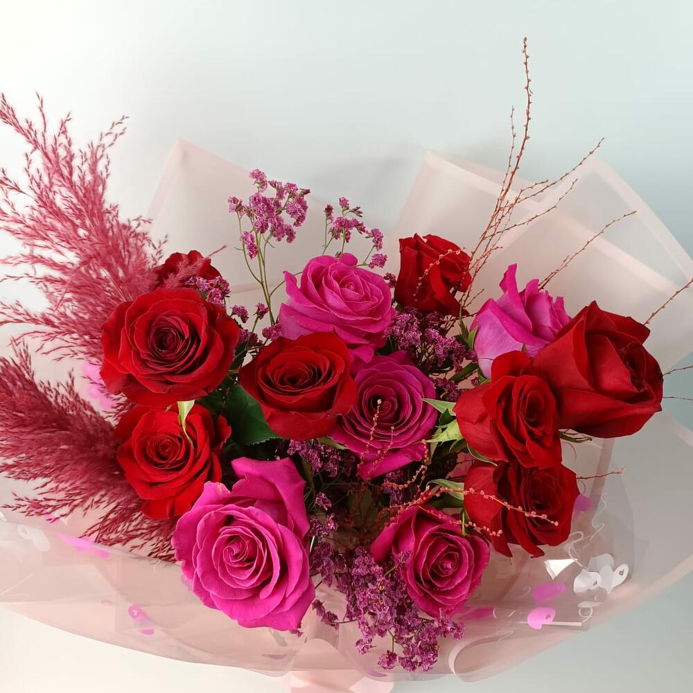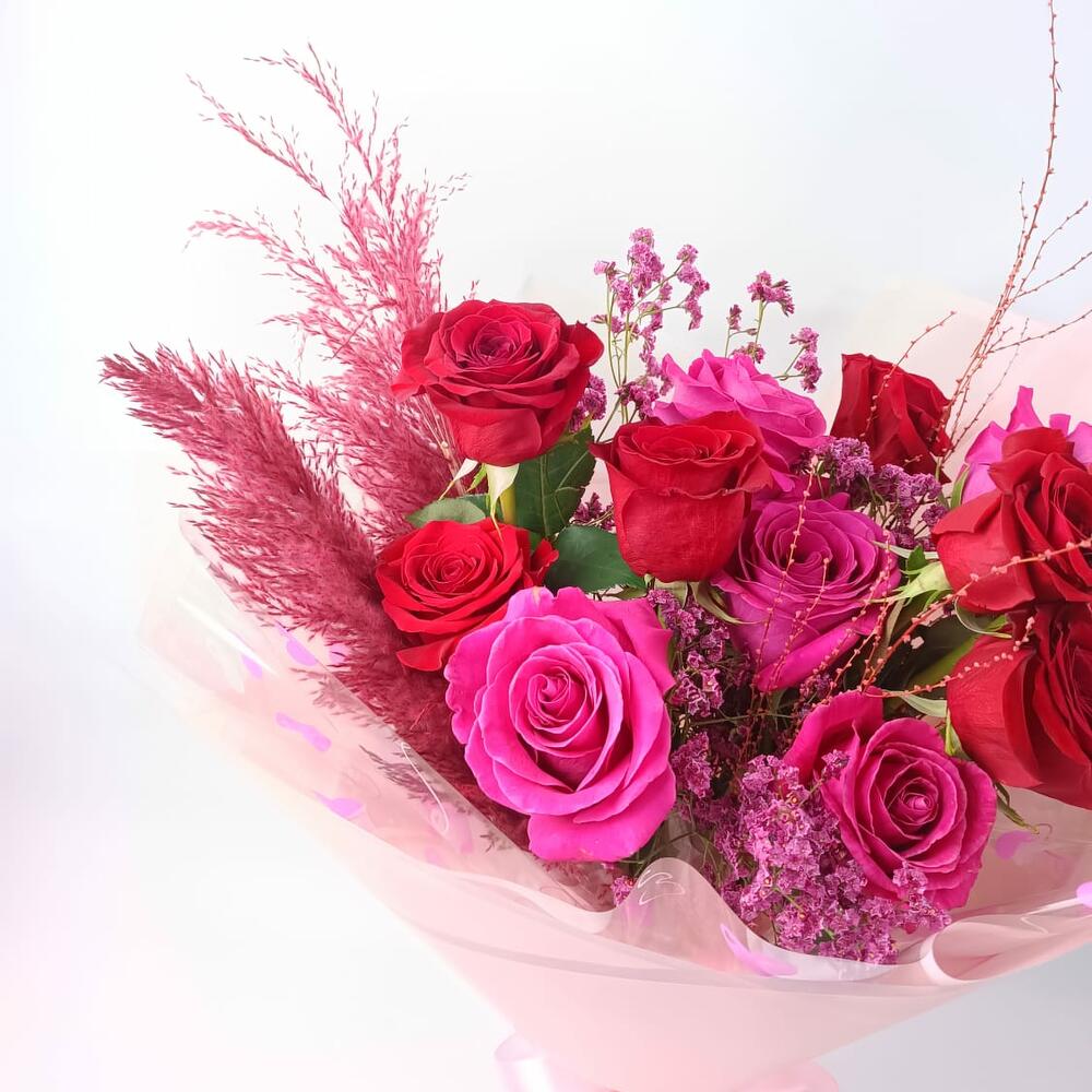 rose red - 7 pcs pampas - 1 pcs rose fushia - 5 pcs twigs red - 3 pcs lemonium red - 4 pcs