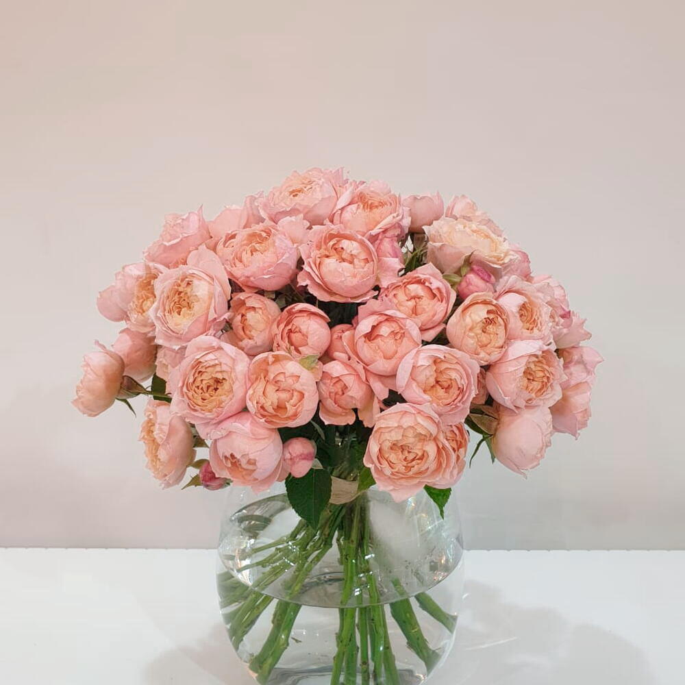 Elegant in its simplicity, this bouquet of delicate peachy-pink garden roses radiates timeless charm and grace. Arranged in a clear glass vase, the soft petals and rounded blooms bring a sense of romantic serenity to any interior. Ideal for weddings, anniversaries, or heartfelt gifts, this arrangement speaks the language of refined beauty. To keep your roses fresh, trim the stems at an angle every two days and change the water regularly. Place the vase in a cool, shaded spot away from direct sunlight and heat.
