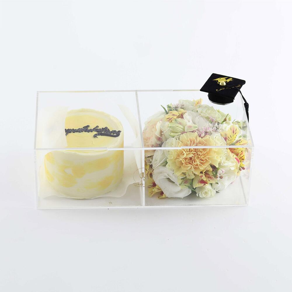 Lisianthus - 3 pcs carnations - 2 pcs butter cream cake - 300 g mini graduation cap - 1 pcs