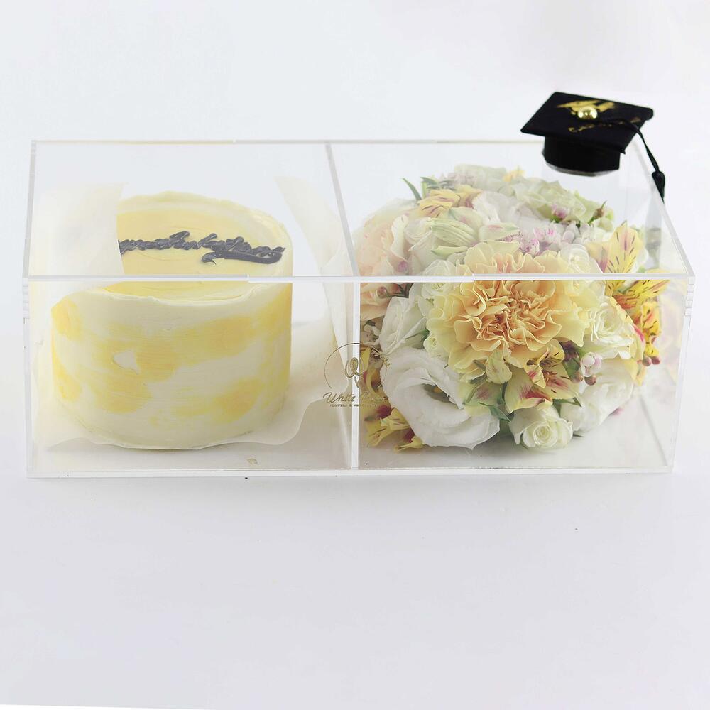 Combination of Carnation , lisianthus and other mix of flowers arranged with 300g cake in an acrylic box