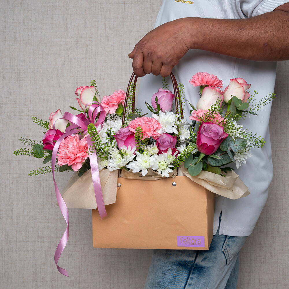 Introducing the Radiant Harmony Bouquet, a luxurious floral arrangement available exclusively at Fellora Flower Boutique Dubai. This captivating bouquet features a stunning assortment of 5 elegant Jamelia Roses, 7 enchanting Purple Roses, 5 delicate Pink Carnations, 3 pristine White Chrysanthemums, 3 sprigs of vibrant Lipudium, and 3 aromatic Eucalyptus stems. All these exquisite blooms are beautifully presented in a chic brown bag, adding a touch of rustic charm to the sophisticated arrangement. The Radiant Harmony Bouquet is perfect for any occasion, whether youre celebrating a milestone, expressing your love, or simply bringing a touch of natures beauty into your home. The harmonious blend of rich colors and diverse textures creates a visually stunning arrangement that radiates elegance and grace. Each bouquet is meticulously handcrafted by our expert florists, ensuring that every flower is perfectly placed to highlight its natural beauty. The stylish brown bag adds a unique and contemporary touch, making this bouquet a true statement piece. Experience the radiant beauty and elegant charm of the Radiant Harmony Bouquet from Fellora Flower Boutique Dubai, where every bloom tells a story of sophistication and style.