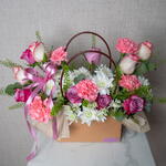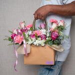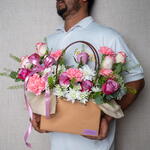 Eucalyptus - 3 pcs white chrysanthemum - 3 pcs pink carnation - 5 pcs brown bag - 1 pcs purple roses - 7 pcs jamelia roses - 5 pcs lipudium - 3 pcs