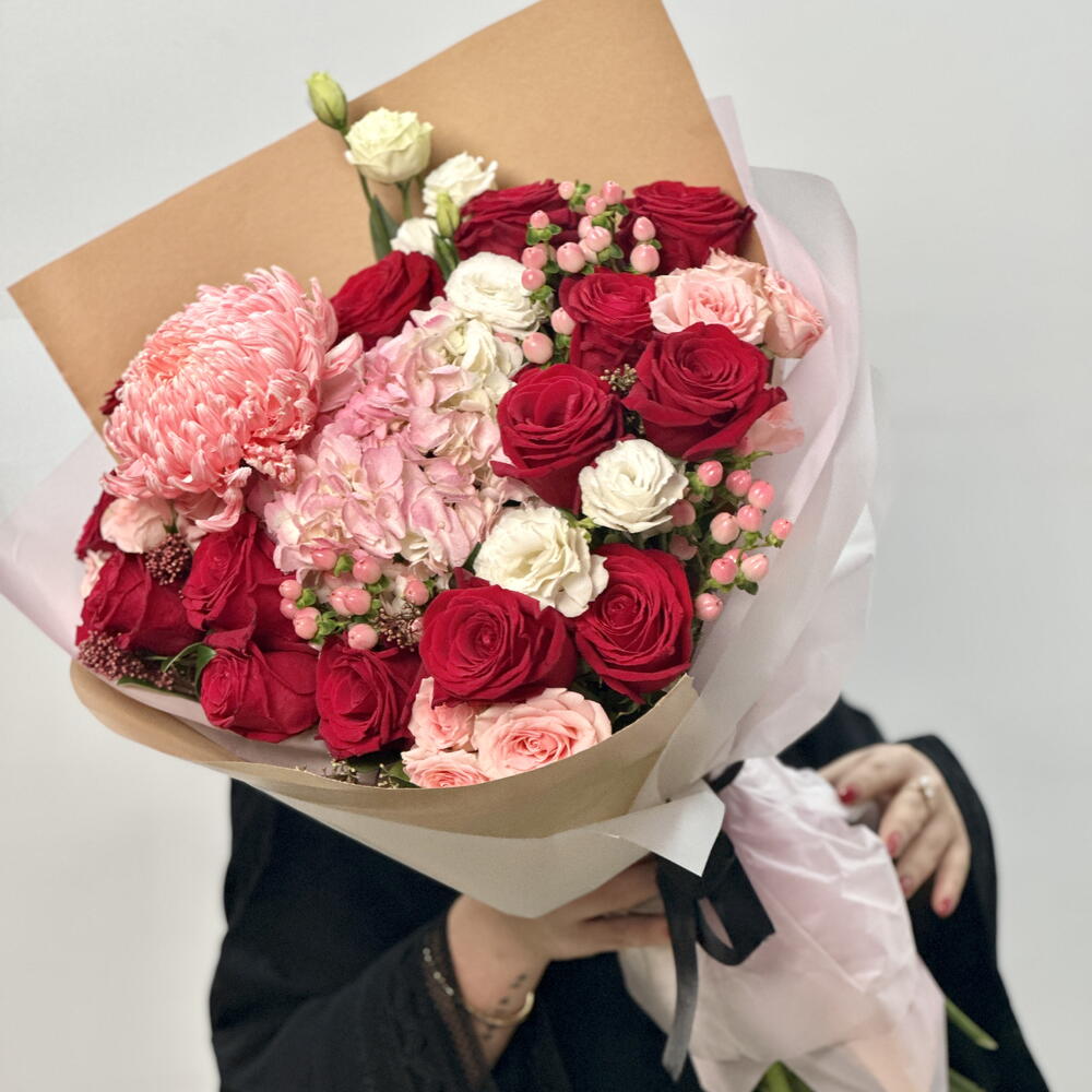 skimmia - 3 pcs hydrangea pink - 1 pcs lisianthus white - 3 pcs hypericum pink - 4 pcs red roses - 15 pcs odilla pink spray rose - 3 pcs deco chrysanthemum - 1 pcs
