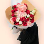 This stunning bouquet combines a harmonious blend of vibrant and delicate blooms. Rich red roses exude romance, while spray pink Odilla adds a soft, charming touch. The playful pink hypericum and pure white lisianthus bring depth and elegance, and the soft pink hydrangea adds a luxurious feel. Red skimmia berries and a single decorative chrysanthemum provide unique texture and contrast, creating a bouquet full of character. Wrapped in a stylish combination of brown and pink paper, this arrangement is both sophisticated and warm, making it a perfect choice for a thoughtful, heartfelt gift.
