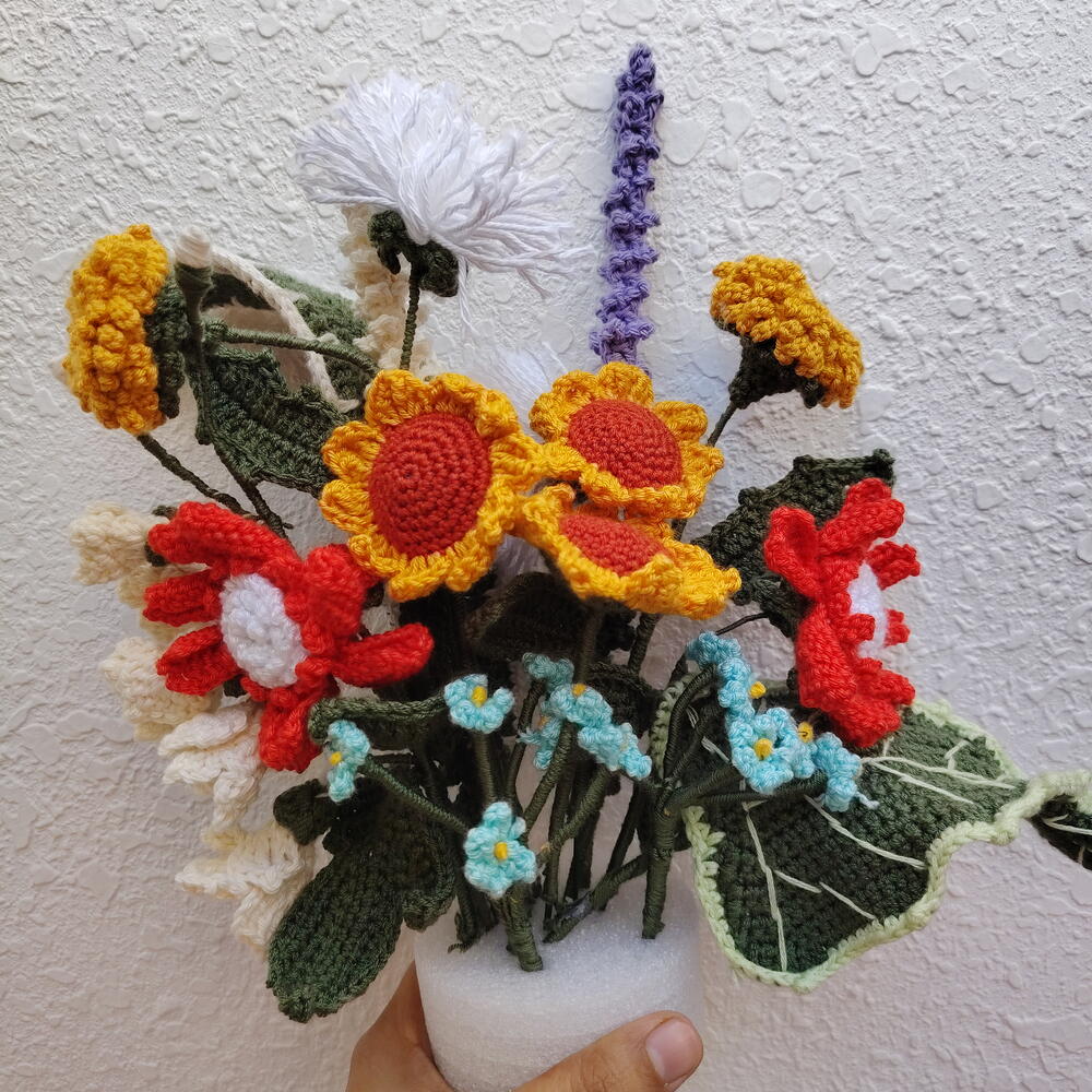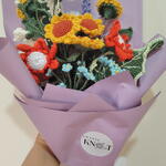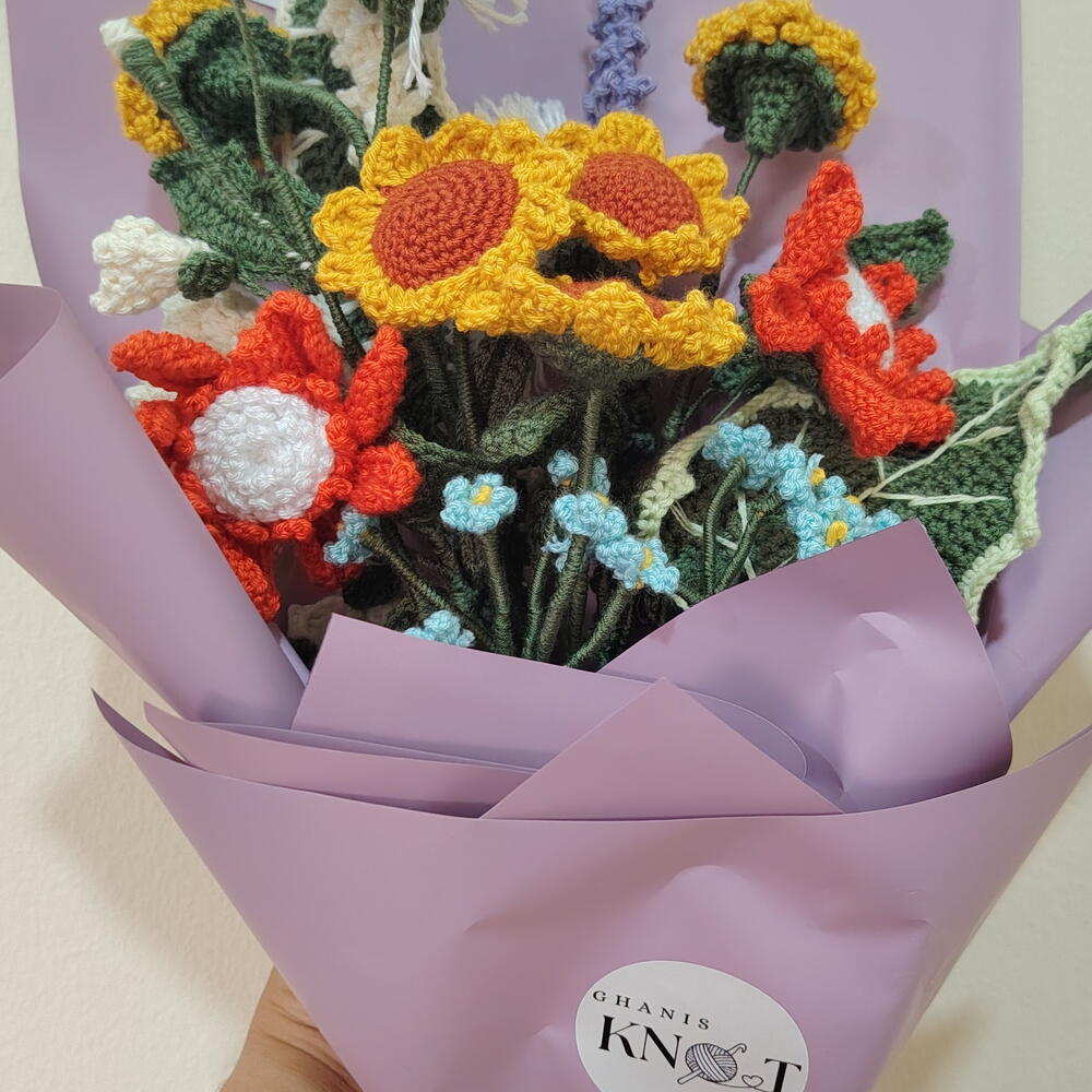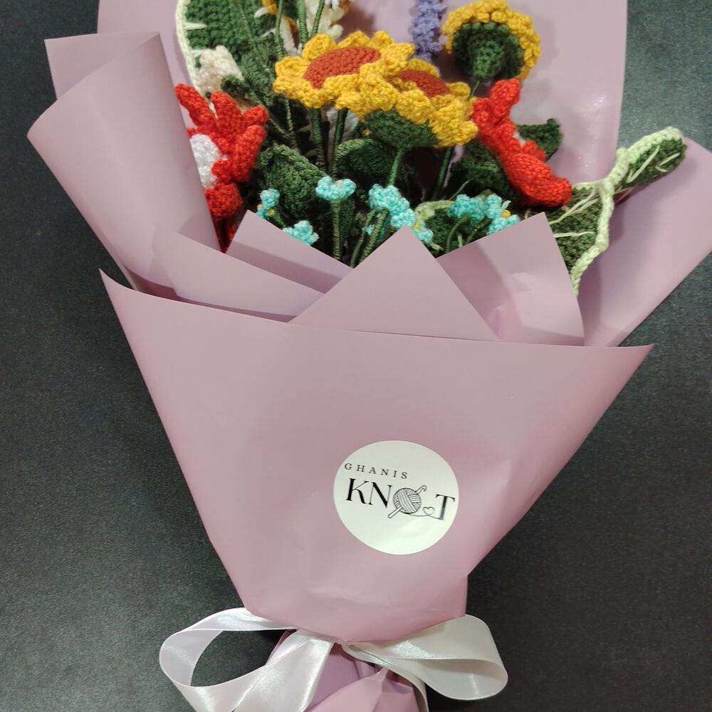 A burst of sunshine that lasts forever. Why settle for flowers that wilt in a week when you can gift a hand-knitted masterpiece? This vibrant bouquet is a celebration of color and texture, featuring a curated mix of meadow-inspired blooms. The Floral Recipe: Golden Sunflowers: The centerpiece of the bouquet, symbolizing joy and longevity. Lavender Sprigs: Hand-stitched purple accents for a touch of rustic charm. Morning Blossoms: Delicate blue and orange flowers to create a balanced, vibrant palette. Why Choose This Bouquet? Master Craftsmanship: Every petal is individually crocheted using premium, pill-resistant yarn to ensure a soft, luxury finish. Designer Gift Wrapping: Our signature Ghanis Knot presentation includes professional Korean-style layering in soft lavender tones, tied with a crisp white satin ribbon. The Gift of Care: Includes a designer Important Notice card with simple tips to keep your bouquet looking fresh for years. Pet Allergy Friendly: 100% pollen-free and safe for homes with sensitive pets or allergy sufferers.