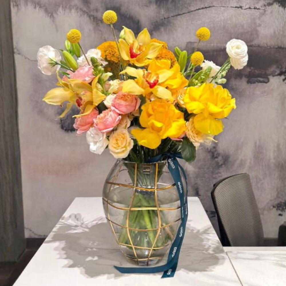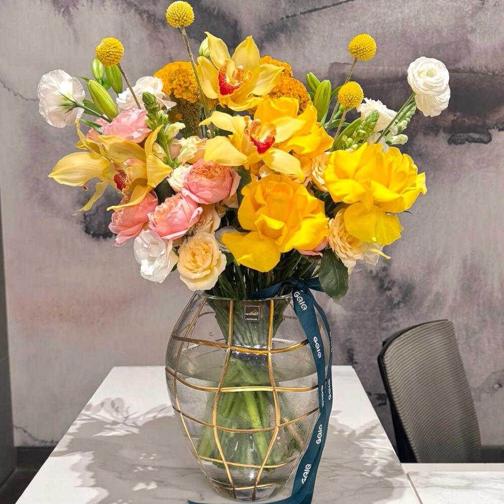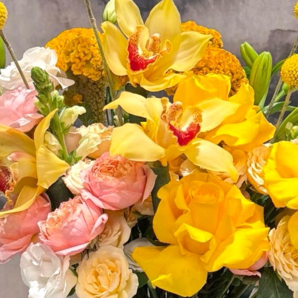 Bring an aura of pure, radiant energy into any room with this luxurious and uniquely structured arrangement. We have masterfully combined exotic yellow Cymbidium orchids and striking yellow lilies with the whimsical texture of Craspedia globes and velvety Julieta roses. 💛🌼 🥹 Best For: High-End Graduations, Corporate Congratulations, New Home celebrations, or an unforgettable Birthday surprise. ☀️💛