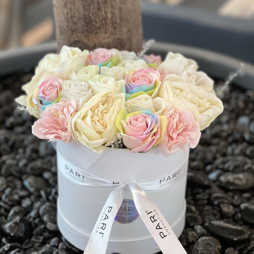 Experience the timeless elegance of the Rainbow mix Bouquet Flower Soap Box, which features sophisticated soap roses in a classic ivory shade. This exquisite set is perfect for adding a touch of luxury to your bathing experience or enhancing your home with its refined beauty.