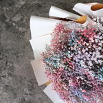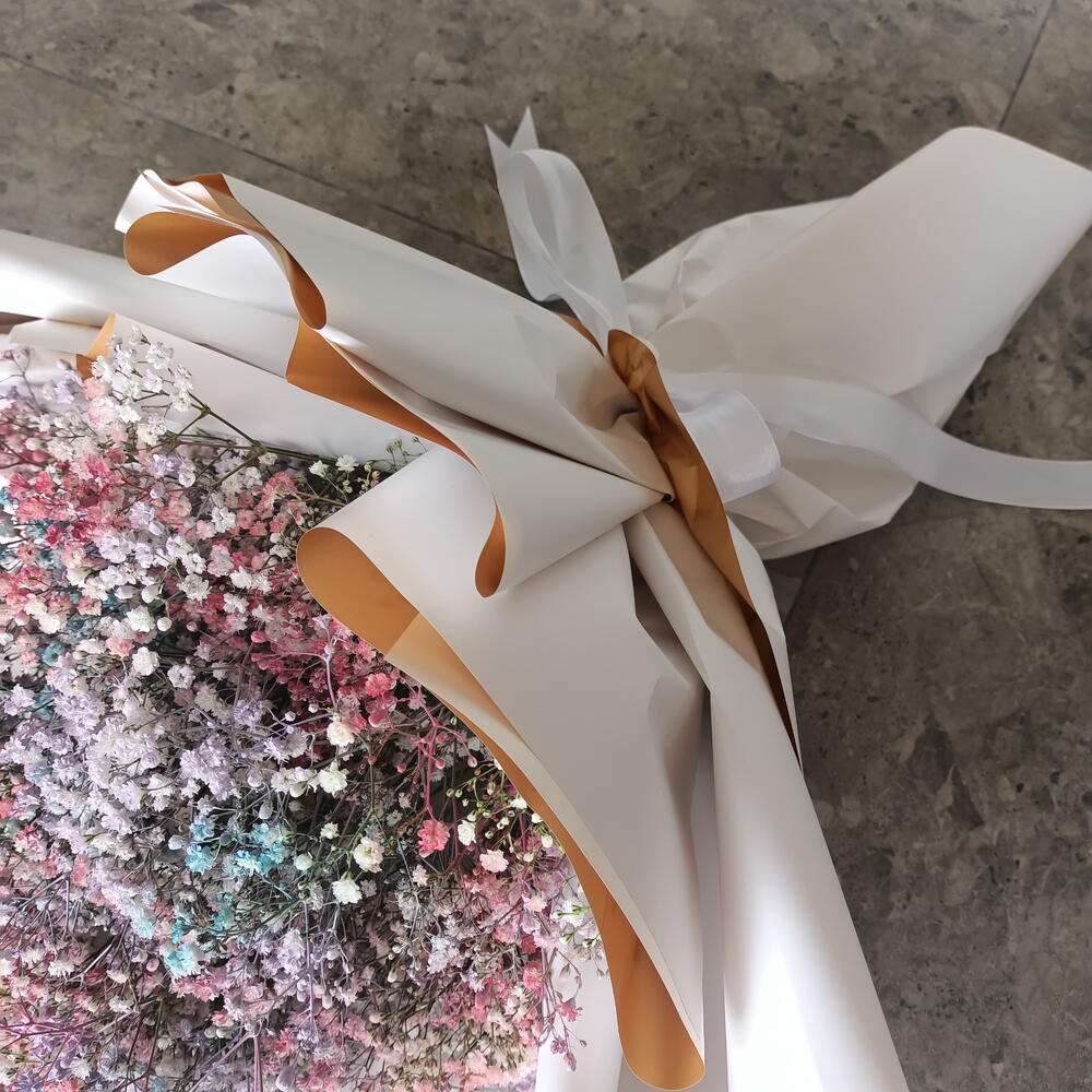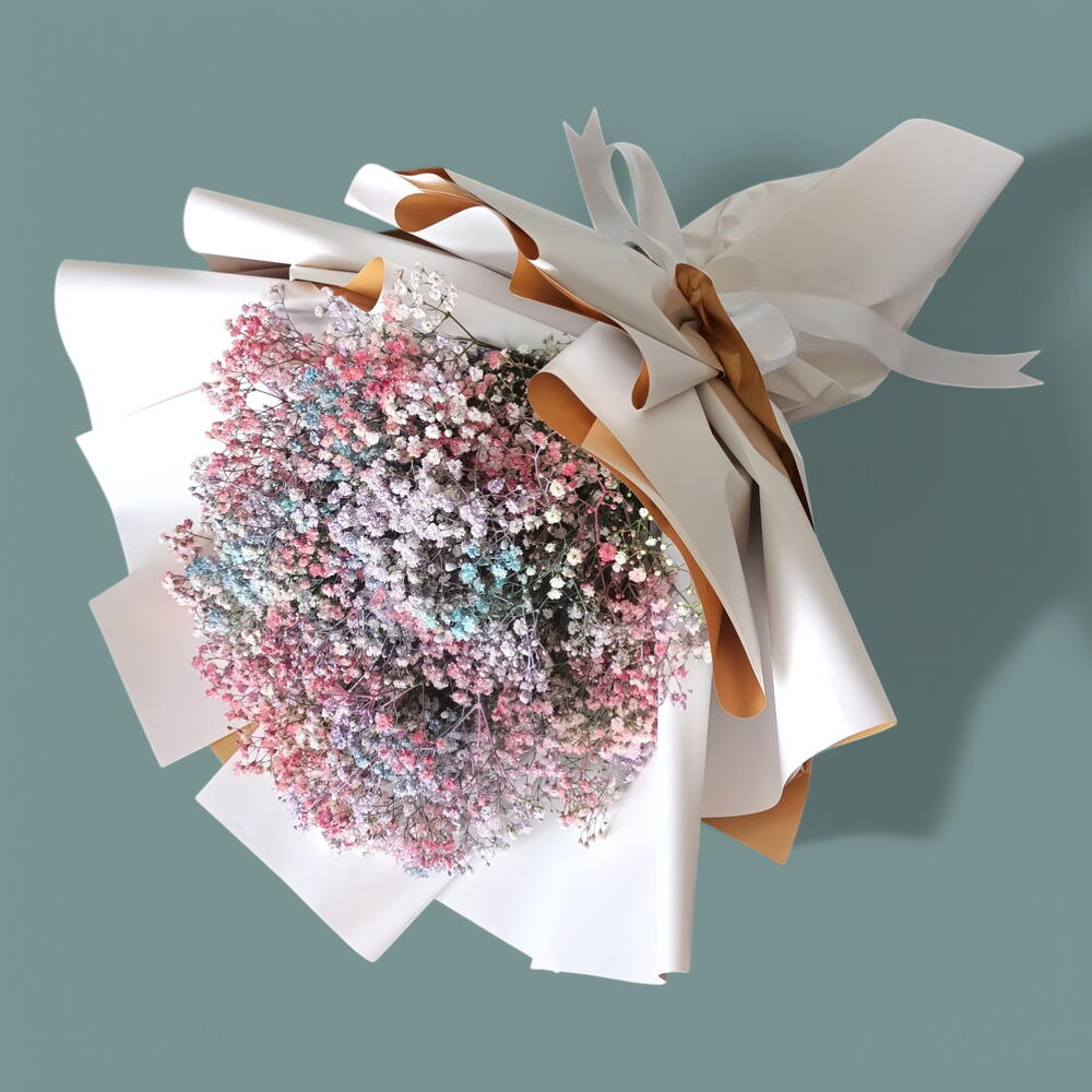A symphony of delicate gypsophila blooms in a kaleidoscope of fresh, vibrant hues. This enchanting bouquet captures the essence of joy and celebration, offering a whimsical touch to any occasion. The tiny blossoms create a cloud-like effect, adding an airy lightness and charm.
