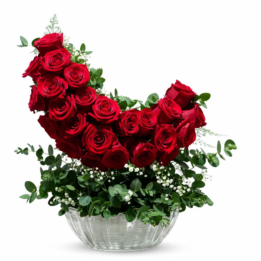 A beautifully crafted crescent arrangement set in a natural basket, adorned with elegant blooms and soft greenery. Inspired by the sacred moon of Ramadan, it brings warmth, serenity, and refined charm to Iftar tables and thoughtful gifting.