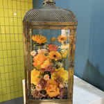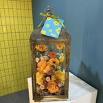 Chrysanthemum - 2 pcs Sunflower - 1 pcs Yellow rose - 2 pcs orange rose - 2 pcs gerbera yellow - 2 pcs tanacetum spray daisy - 2 pcs spray roses pink - 2 pcs caspedia - 2 pcs glass lantern - 1 pcs