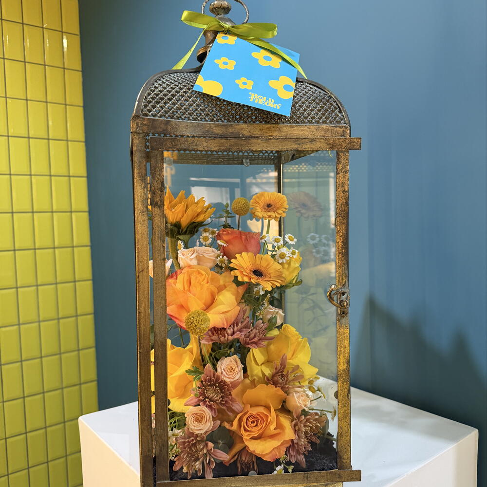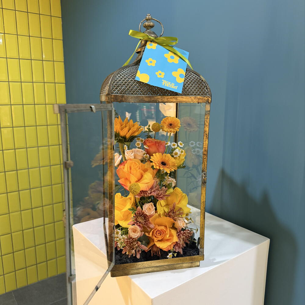 Chrysanthemum - 2 pcs Sunflower - 1 pcs Yellow rose - 2 pcs orange rose - 2 pcs gerbera yellow - 2 pcs tanacetum spray daisy - 2 pcs spray roses pink - 2 pcs caspedia - 2 pcs glass lantern - 1 pcs