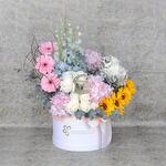 sunflowers - 4 pcs pink Gerbera - 3 pcs pink hydrangea - 3 pcs white round box - 1 pcs ramadan kareem topper - 1 pcs cinerea eucalyptus - 6 pcs white roses - 15 pcs stems blue delphinium - 3 pcs salixsticks - 2 pcs