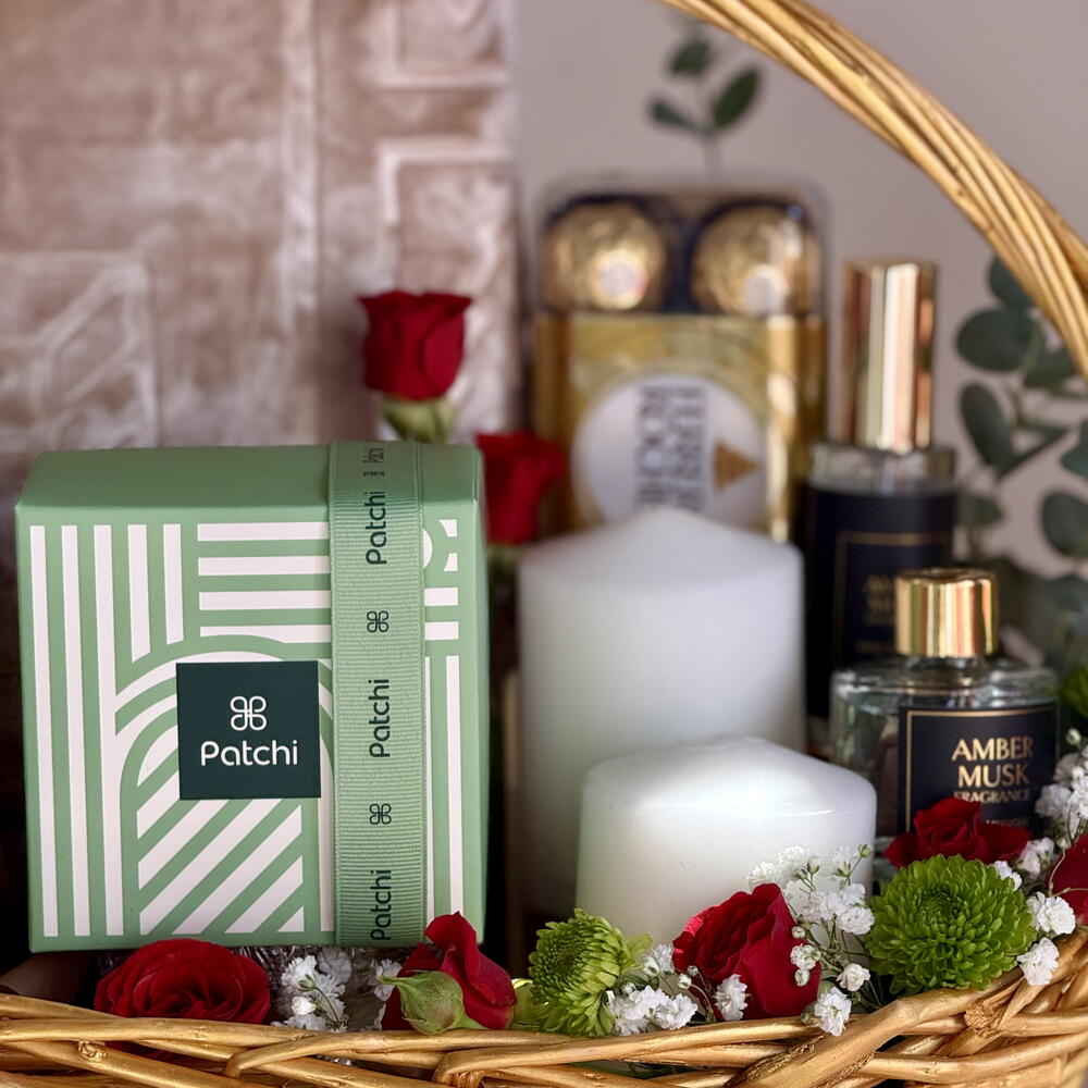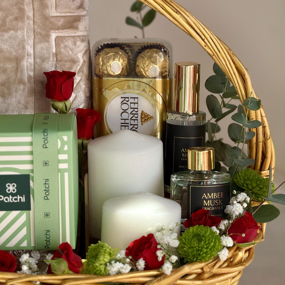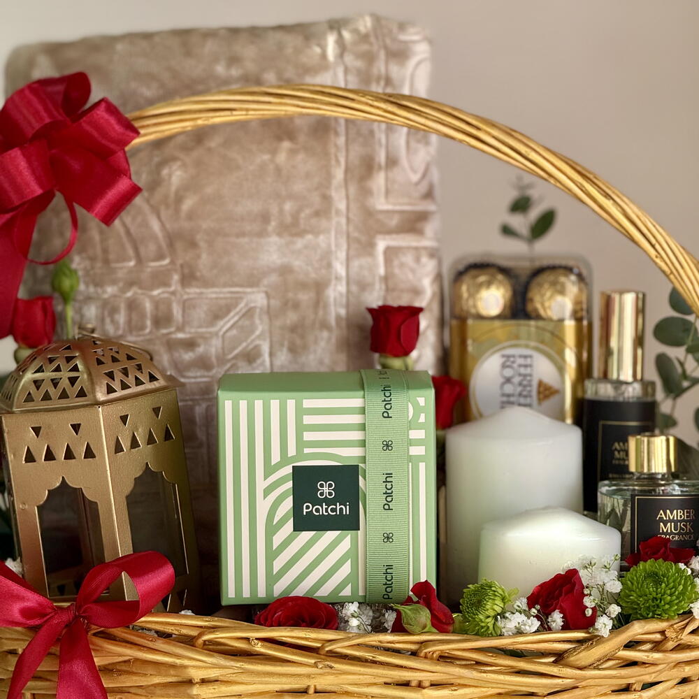 Celebrate the blessings of Ramadan with this luxuriously curated gift hamper, beautifully arranged in a premium woven basket. This elegant hamper features premium dates, fresh floral accents, indulgent Ferrero Rocher chocolates, Patchi chocolates (250 g), a soothing scented candle, a decorative Ramadan lantern, aromatic musk room fragrance, and a soft prayer mat. A perfect blend of spirituality, warmth, and premium gifting ideal for Ramadan celebrations, family gatherings, or corporate gifting.