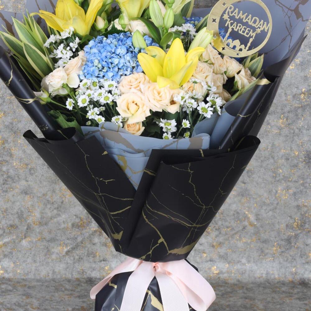 Product Details:-3 Stems Yellow Lilies, 2 Blue Hydrangea, 5 Stems Peach Spray Roses, 5 Stems White Chrysanthemums, Leaves - 3 Stems Song of India, Beautifully Wrapped in Grey and Black Golden Marble Wrapping, Ramadan Kareem Topper, Tied with Peach Ribbon Bow