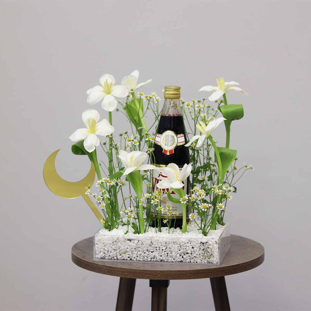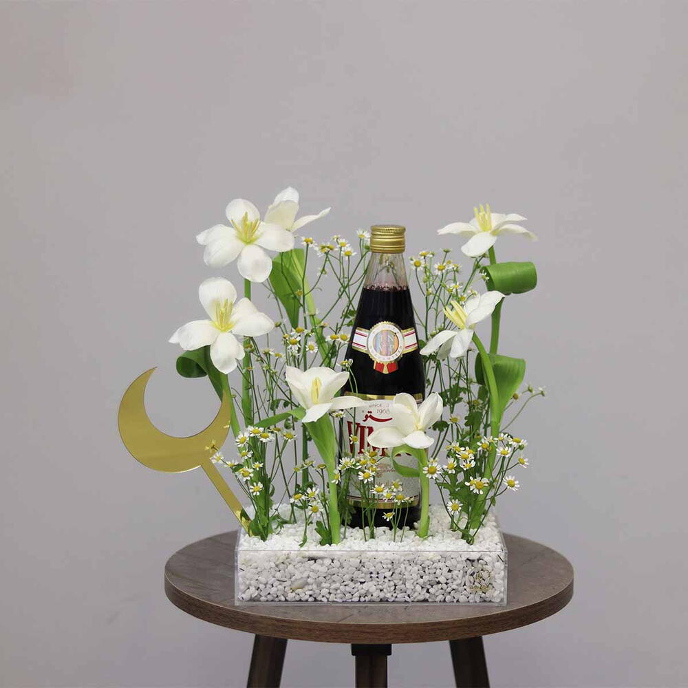 Combination of Tulip, Daisy and other mix of flowers with vimto arranged in a Acrylic Tray