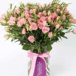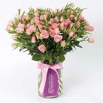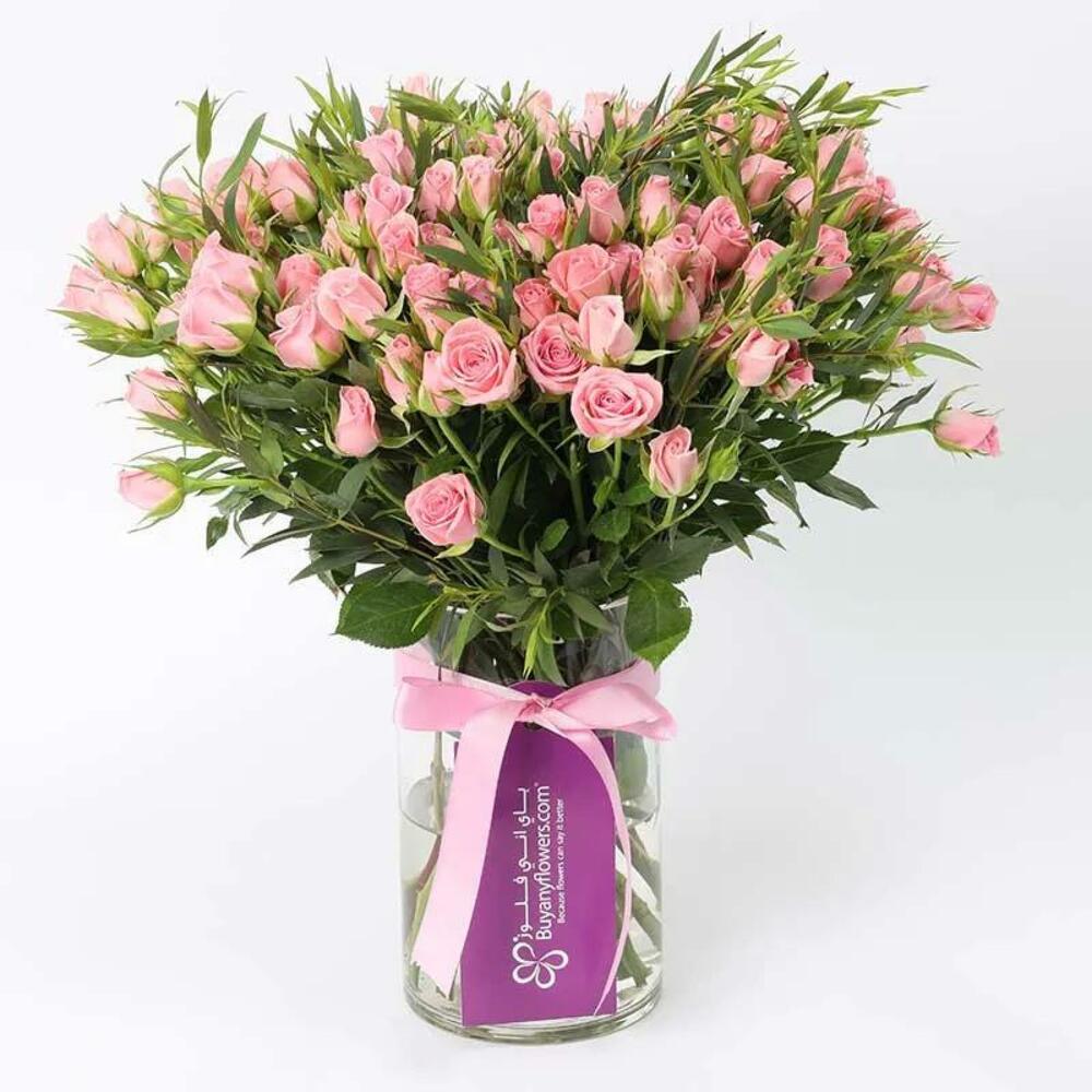 parvifolia stems - 3 pcs light pink baby rose stems - 21 pcs arranged in a cylinder vase and tied with a pink ribbon bow - 1 pcs