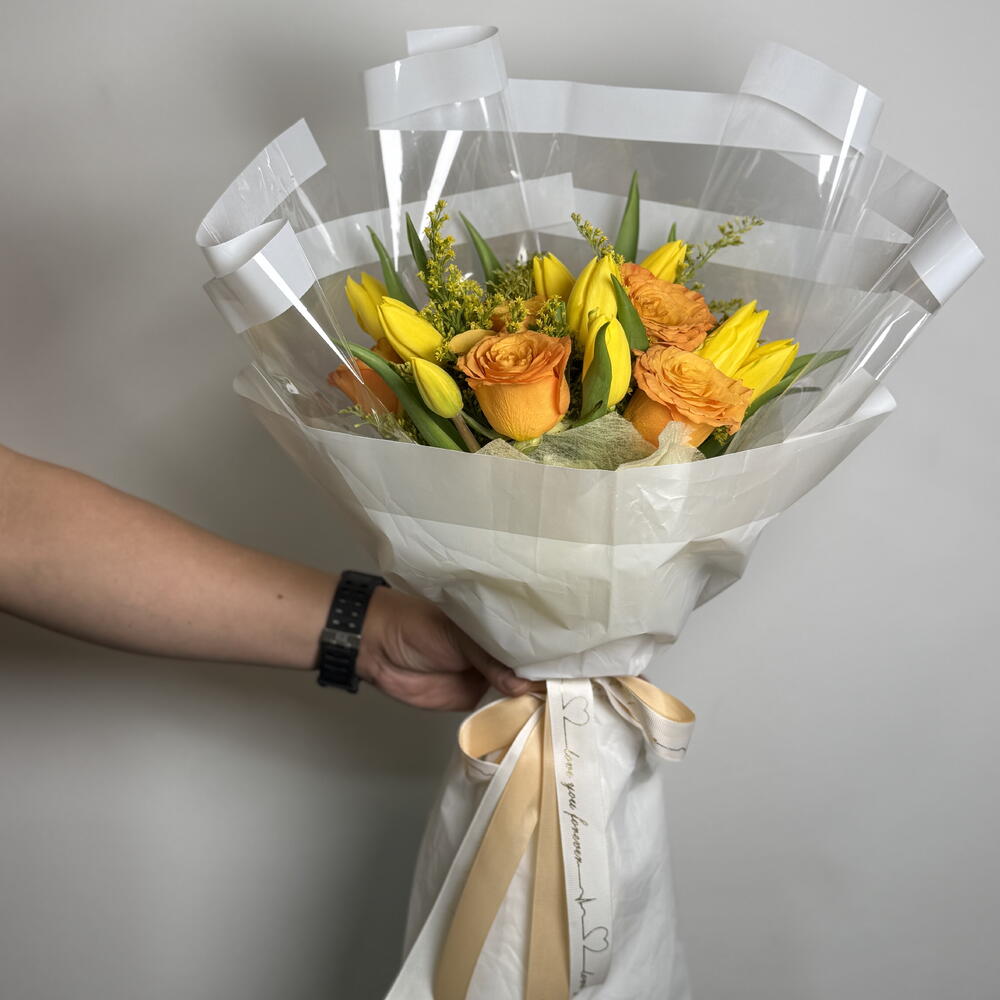 The Golden Sunrise Bouquet is a radiant floral arrangement that blends vibrant yellow tulips with rich orange roses, creating a warm and uplifting color harmony. Accented with fresh green foliage and delicate fillers, the bouquet captures the glow of a beautiful morning sunrise. Elegantly wrapped in soft ivory paper with a transparent overlay and finished with a graceful satin ribbon, this bouquet symbolizes happiness, positivity, and heartfelt appreciation—perfect for celebrations, congratulations, or brightening someone’s day. 🌼🧡