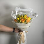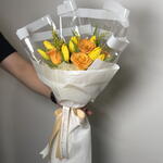 Solidago - 4 pcs yellow tulips - 10 pcs roses orange - 10 pcs