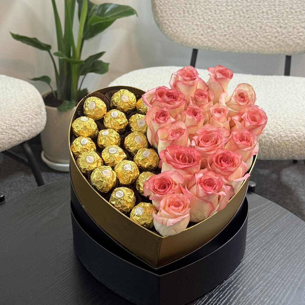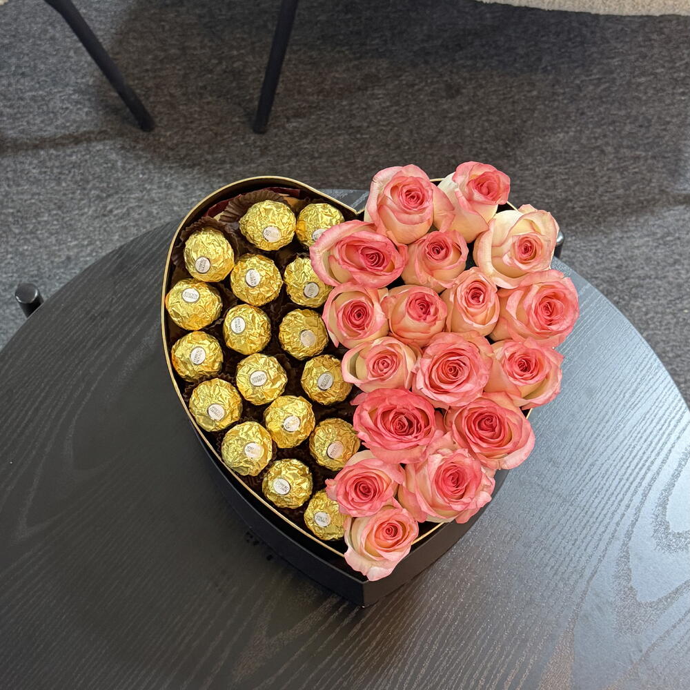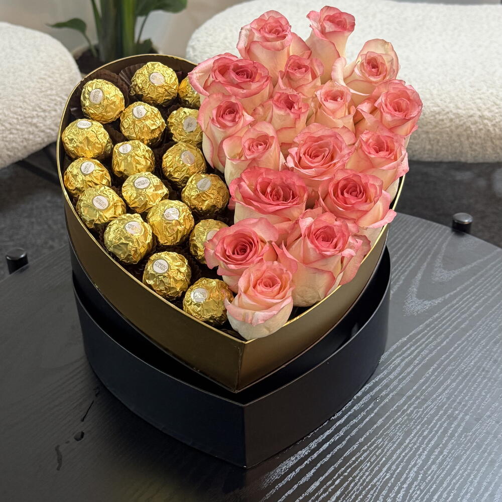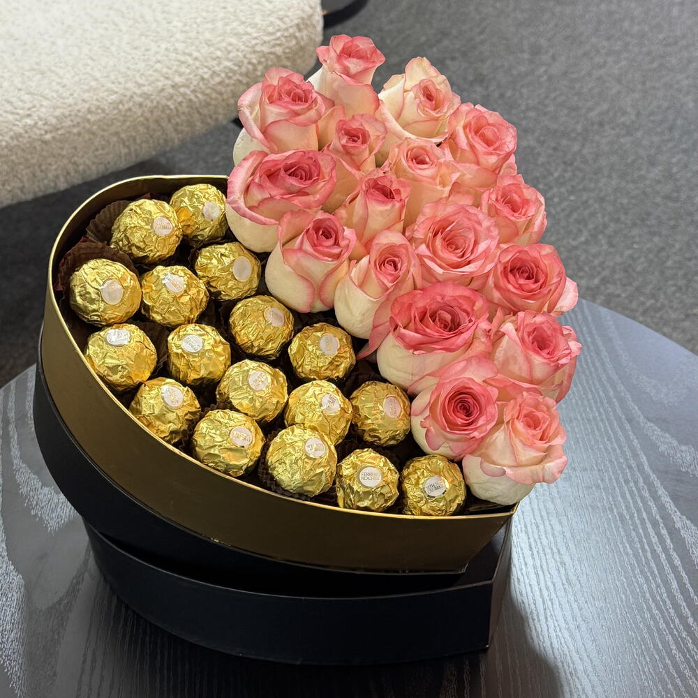 Experience the unique blend of elegance and sweetness with our meticulously arranged Flowers in a Box. Each box features 18 pink roses, known for their exquisite beauty and soft, gentle hue, evoking feelings of adoration and fascination. While the natural splendor of these flowers captivates your senses, prepare to be further indulged with 12 pieces of our decadently rich and delectable Roses chocolates. This combination of aesthetic beauty and gastronomic delight makes this arrangement the perfect gift for your loved ones or a spectacular centerpiece for your living space. Experience sheer bliss with every box