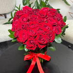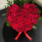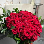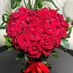 A stunning hand-tied bouquet of vibrant red roses, perfectly arranged in a lush, rounded dome and accented with fresh green foliage. Finished with a classic red satin ribbon, this arrangement radiates timeless romance and elegance. The deep red blooms symbolize love, passion, and admiration, making it an ideal choice for anniversaries, romantic surprises, Valentine’s Day, or heartfelt celebrations. Simple yet powerful, it speaks the language of love in its purest form.