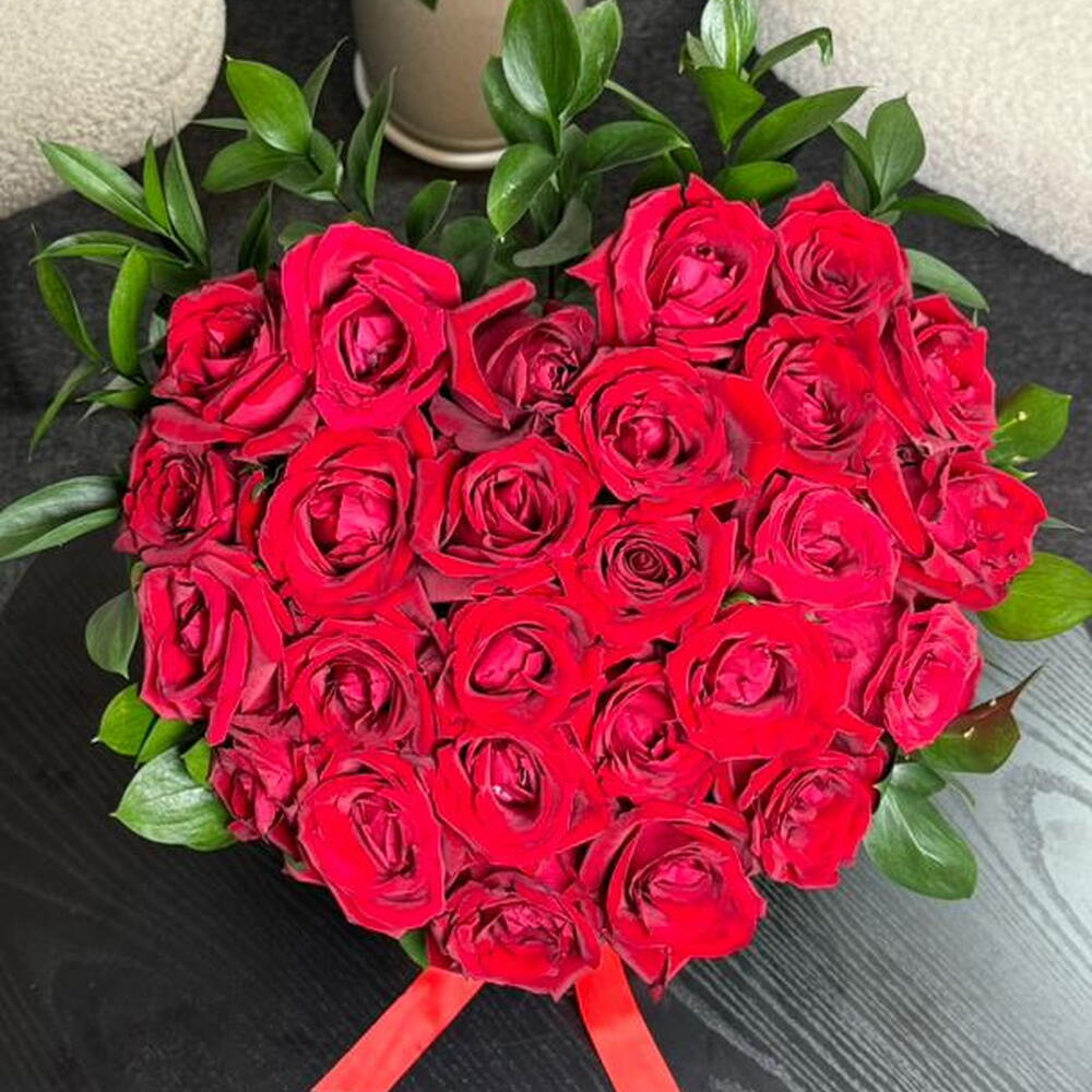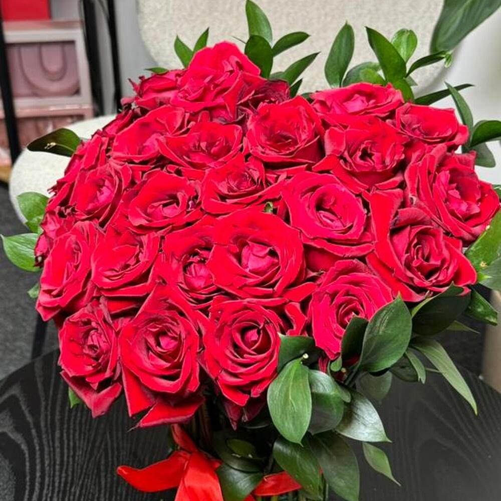 A stunning hand-tied bouquet of vibrant red roses, perfectly arranged in a lush, rounded dome and accented with fresh green foliage. Finished with a classic red satin ribbon, this arrangement radiates timeless romance and elegance. The deep red blooms symbolize love, passion, and admiration, making it an ideal choice for anniversaries, romantic surprises, Valentine’s Day, or heartfelt celebrations. Simple yet powerful, it speaks the language of love in its purest form.