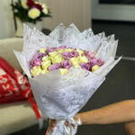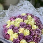 A soft, elegant bouquet blending creamy ivory roses with dreamy lavender blooms, creating a calm and romantic palette. The gentle contrast of pastel tones evokes warmth, grace, and quiet affection, while the white rose-embossed wrapping adds a luxurious, bridal touch. Perfect for anniversaries, birthdays, proposals, or moments that call for understated elegance and heartfelt emotion. 🌸💜