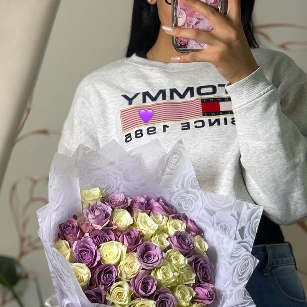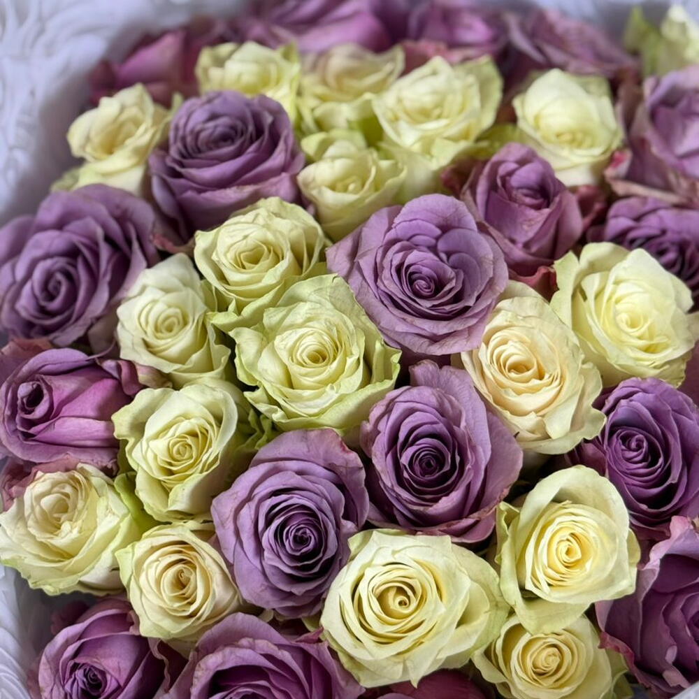 A soft, elegant bouquet blending creamy ivory roses with dreamy lavender blooms, creating a calm and romantic palette. The gentle contrast of pastel tones evokes warmth, grace, and quiet affection, while the white rose-embossed wrapping adds a luxurious, bridal touch. Perfect for anniversaries, birthdays, proposals, or moments that call for understated elegance and heartfelt emotion. 🌸💜