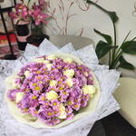 A soft, romantic bouquet blending delicate lilac roses with creamy white roses, beautifully accented by cheerful purple daisies with sunny yellow centers. Wrapped in elegant white floral paper, this arrangement feels light, graceful, and full of charm. Lilac Whisper is perfect for expressing gentle love, appreciation, or heartfelt congratulations—sweet, soothing, and effortlessly elegant.