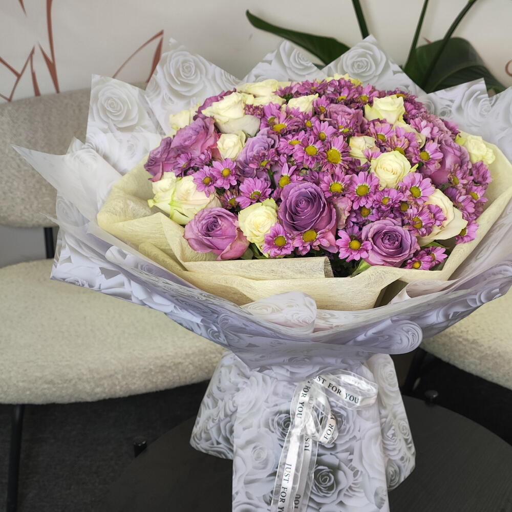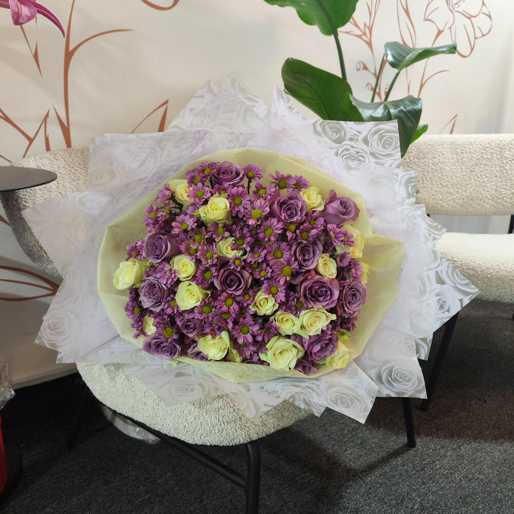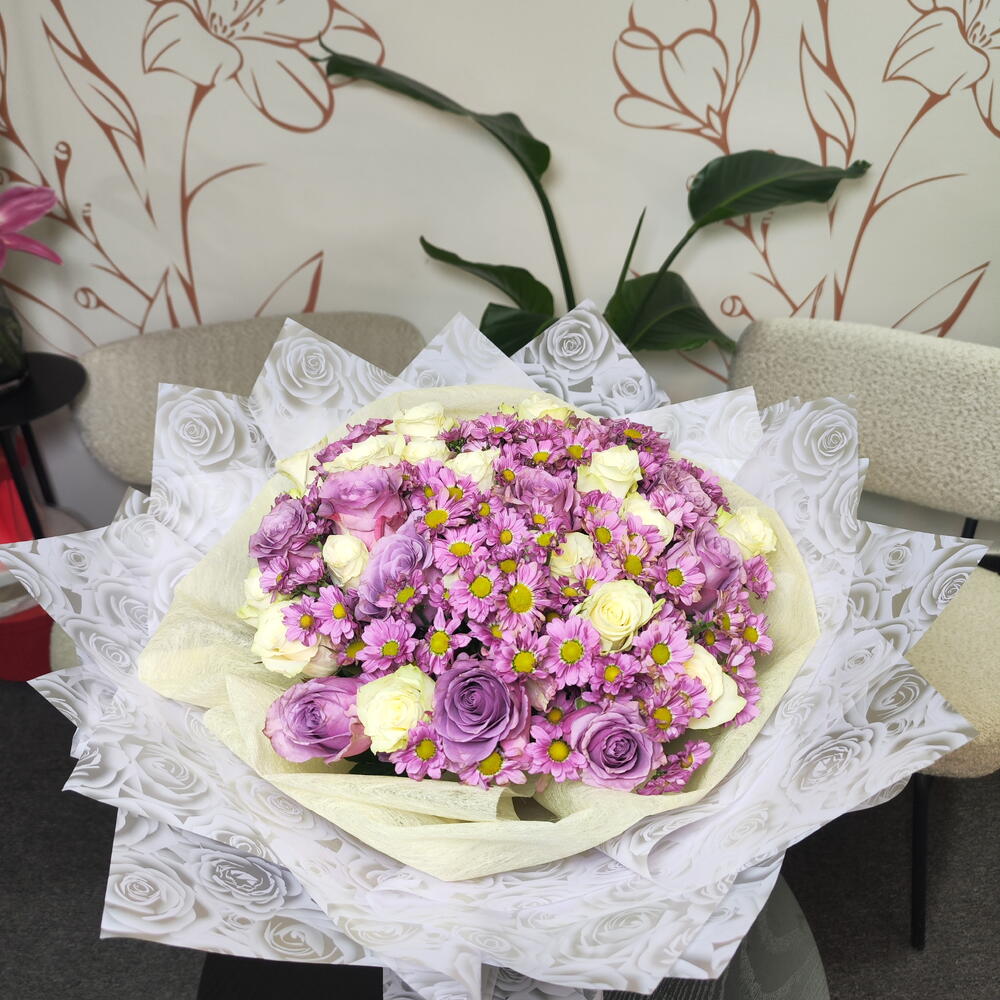 A soft, romantic bouquet blending delicate lilac roses with creamy white roses, beautifully accented by cheerful purple daisies with sunny yellow centers. Wrapped in elegant white floral paper, this arrangement feels light, graceful, and full of charm. Lilac Whisper is perfect for expressing gentle love, appreciation, or heartfelt congratulations—sweet, soothing, and effortlessly elegant.