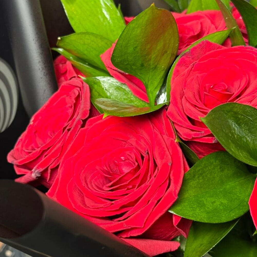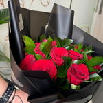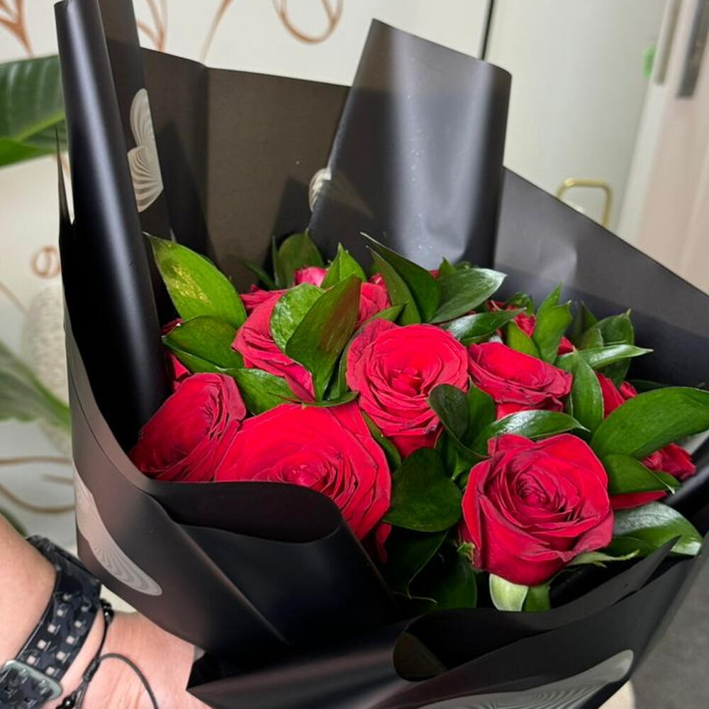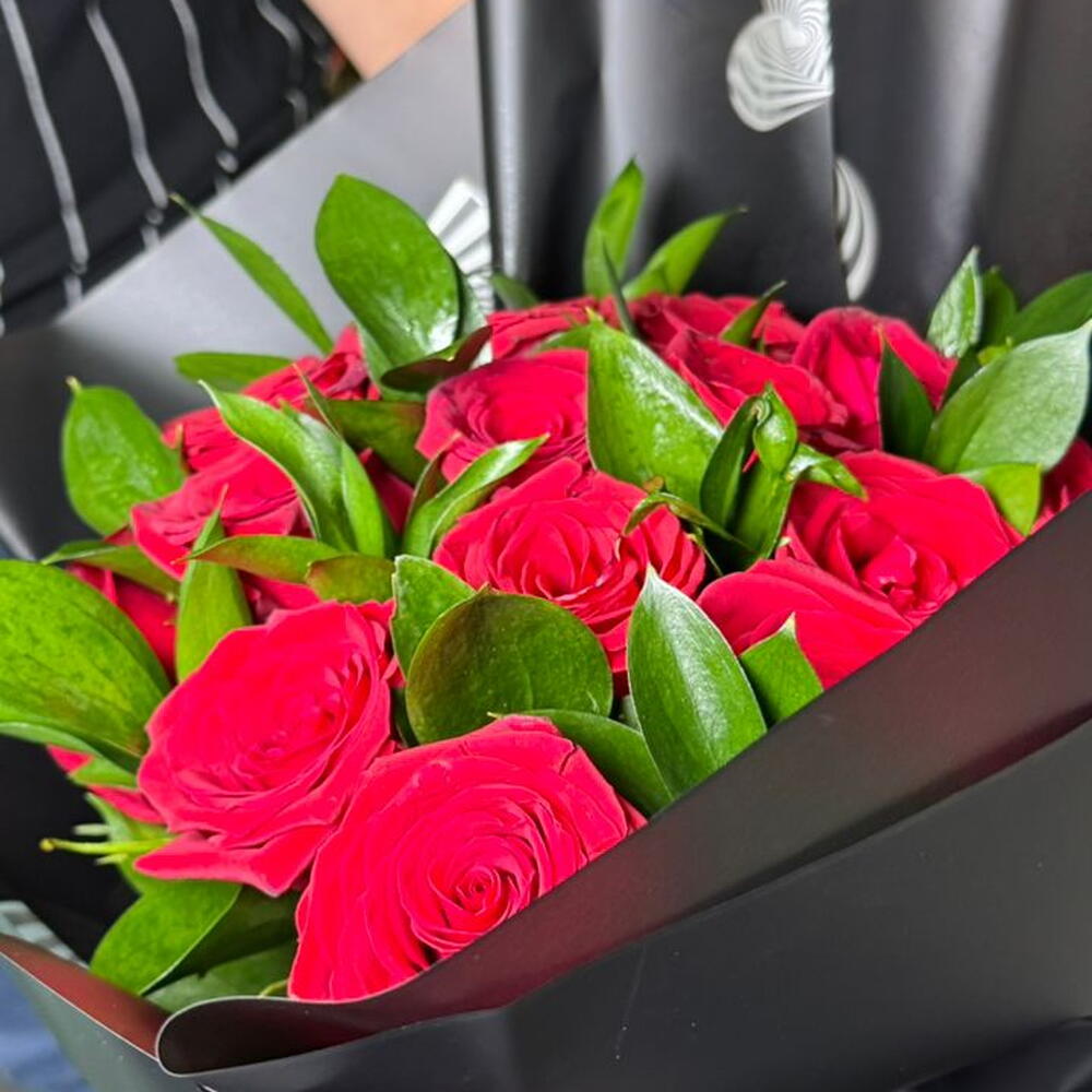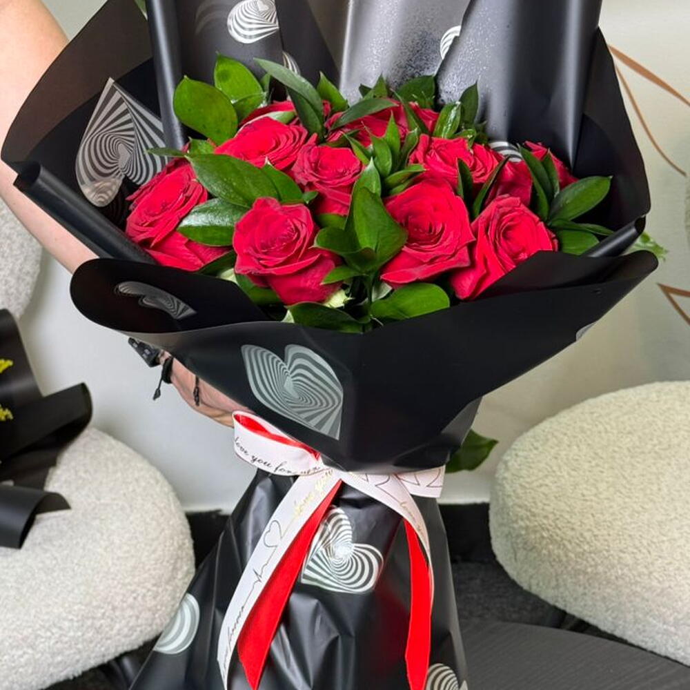 This elegant bouquet features vibrant red roses beautifully arranged with lush green foliage, wrapped in sleek black designer paper accented with modern heart patterns. Finished with a stylish ribbon, it offers a bold yet romantic look—perfect for expressing love, admiration, or celebrating a special occasion.