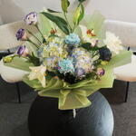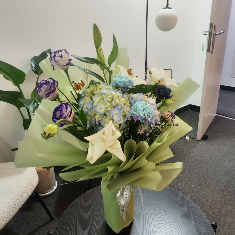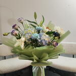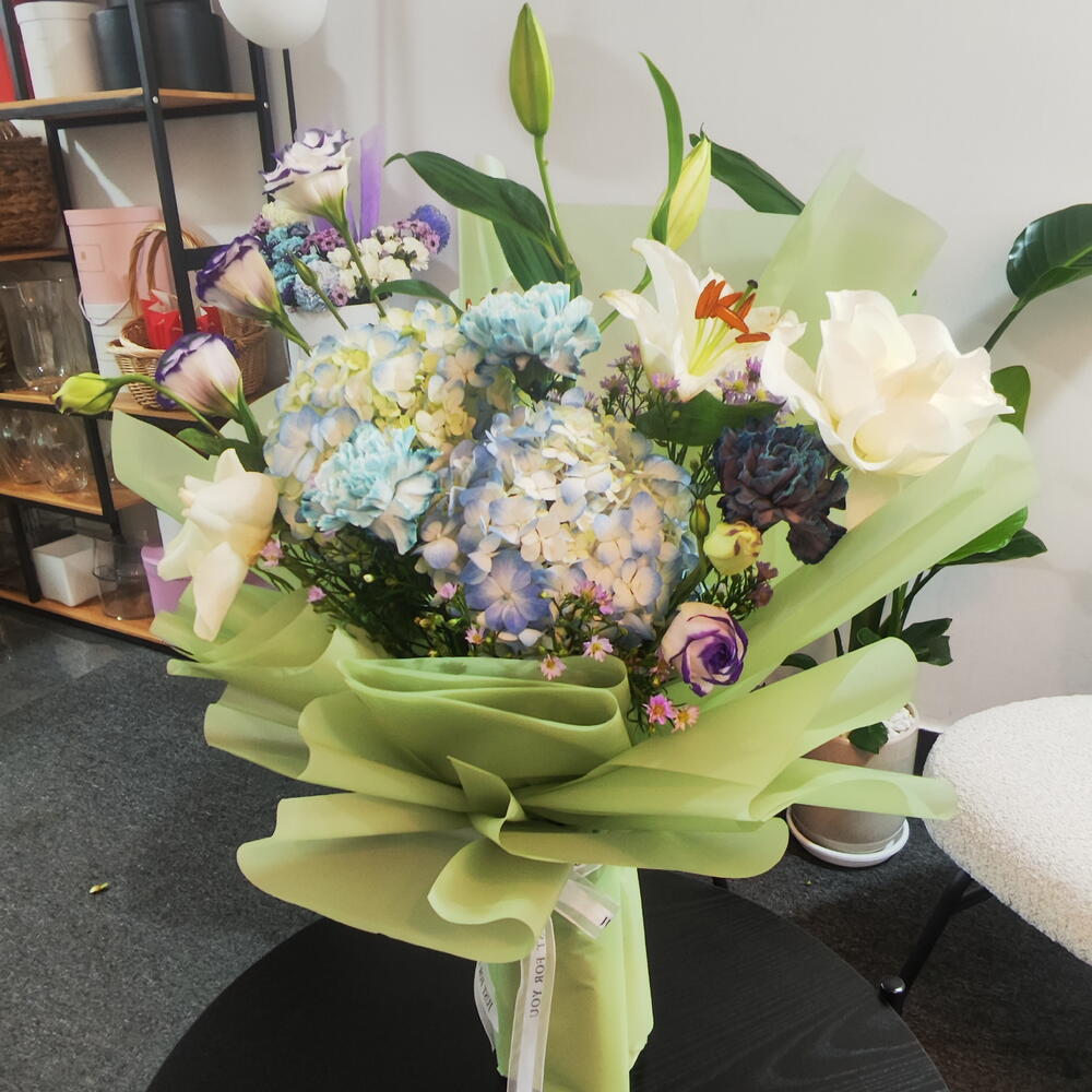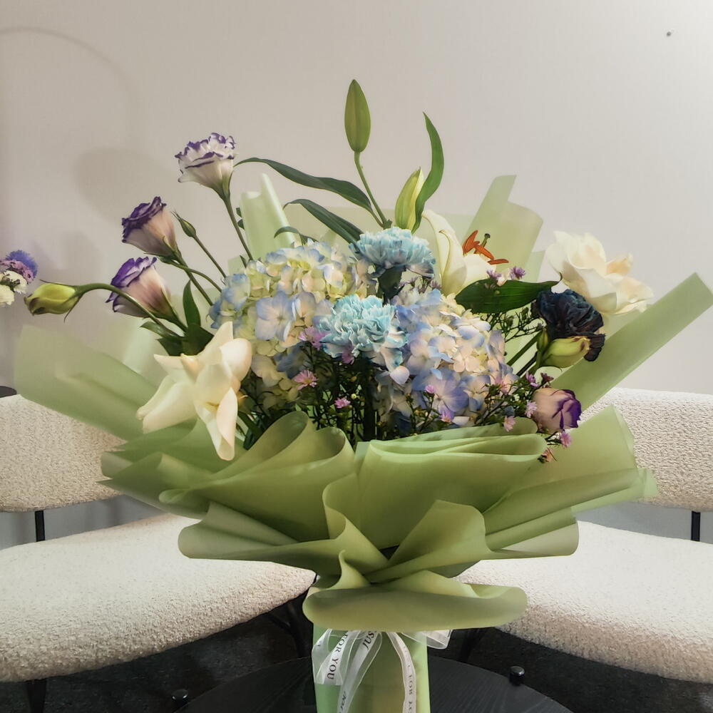 This bouquet showcases soft blue hydrangea as the centerpiece, surrounded by elegant white lilies and delicate lisianthus with gentle purple accents. Fresh greenery adds depth and balance, while the pastel green wrapping enhances its calm, natural feel. Overall, it’s a serene and graceful arrangement that feels refreshing, airy, and beautifully refined.