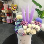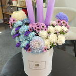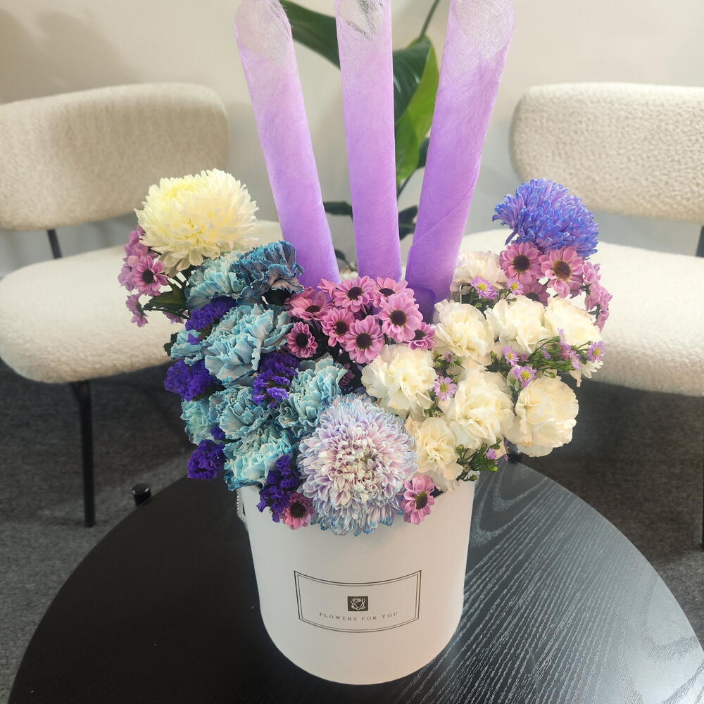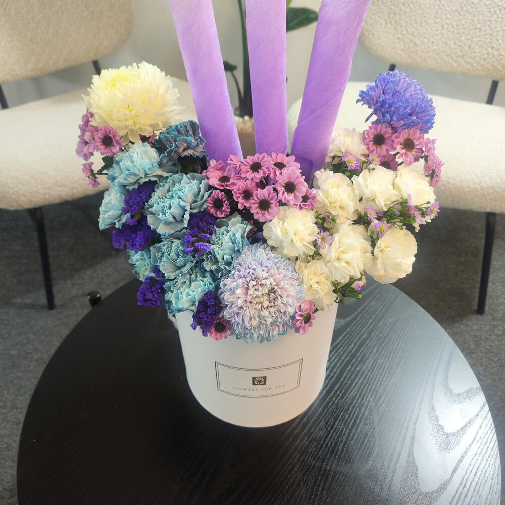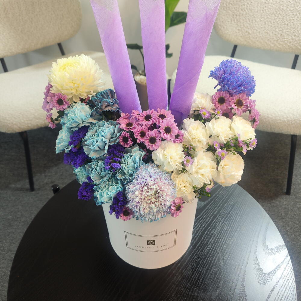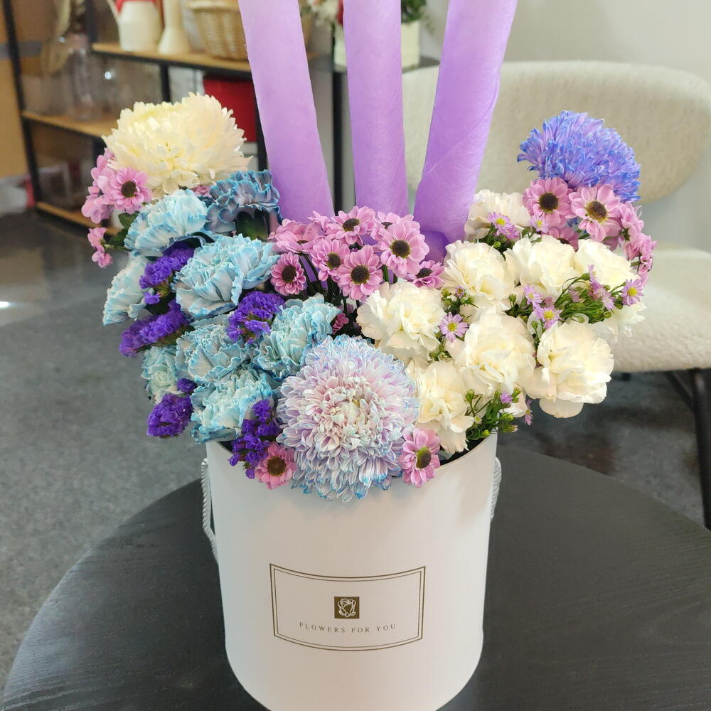 This box arrangement is a soft and dreamy display of pastel florals with a unique decorative touch. It features a mix of lavender, blue, cream, and blush-toned chrysanthemums, paired with delicate white carnations and tiny purple daisy-like blooms. The colors blend beautifully, creating a soothing and elegant palette. Three tall lavender paper accents rise from the center, adding height, symmetry, and a striking modern feel to the design. The flowers are arranged in a clean white hatbox labeled Flowers For You, giving the arrangement a polished, gift-ready look. Overall, it feels whimsical, gentle, and stylish — perfect for celebrations, birthdays, or anyone who loves pastel and artistic floral designs.
