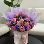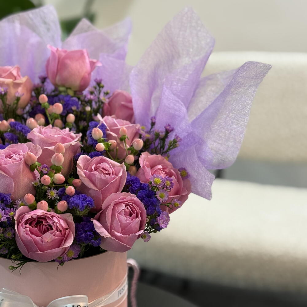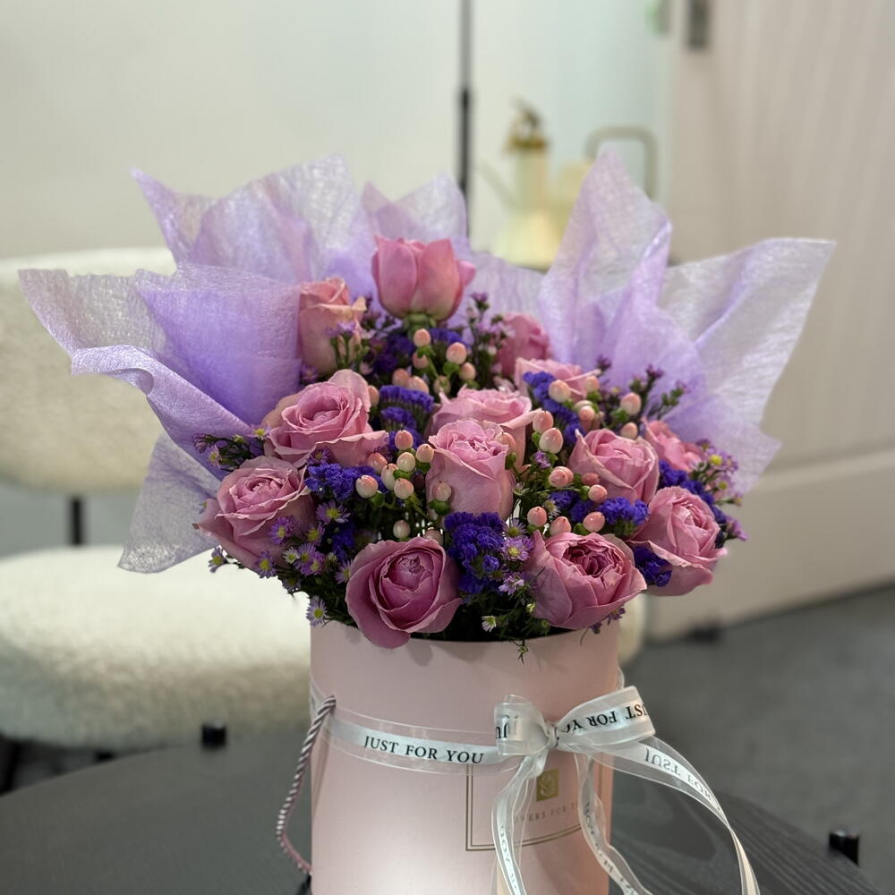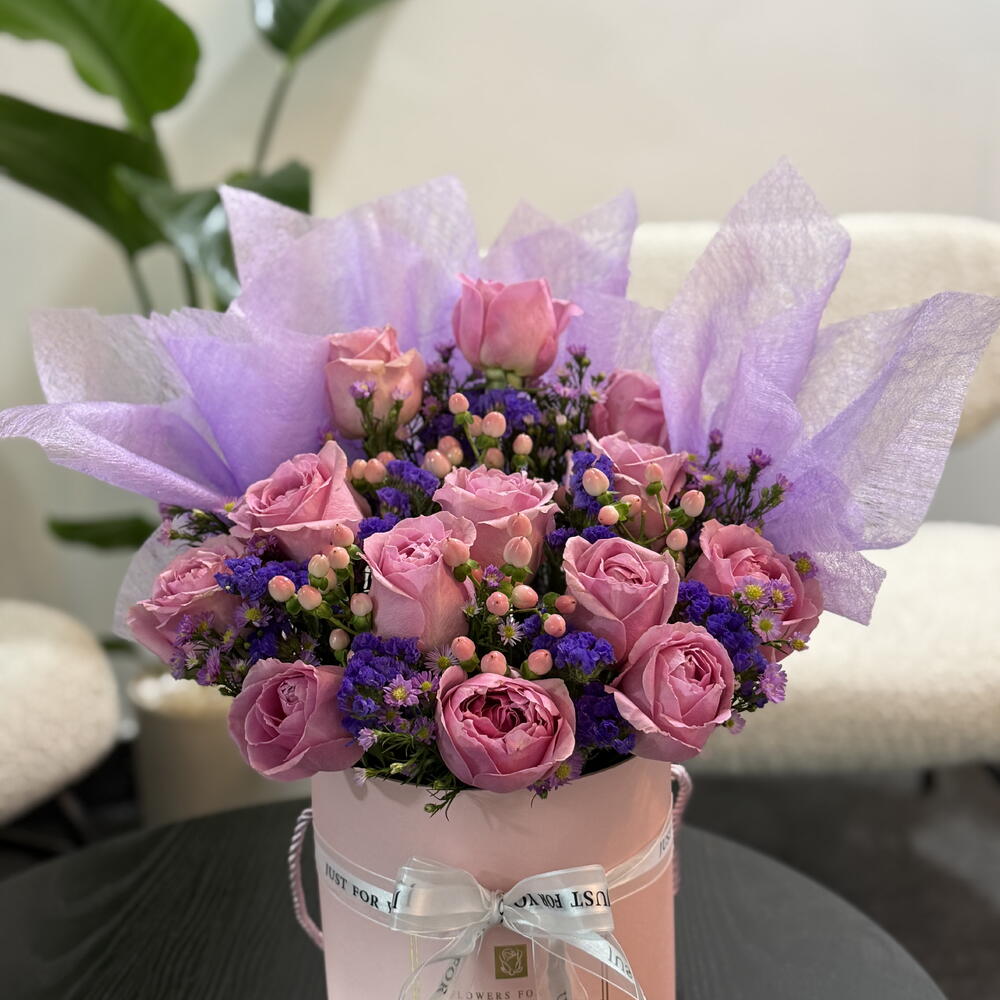 A charming flower box filled with elegant dusty-pink roses, accented by pops of deep purple blooms and delicate pink berries. Wispy lilac wrapping adds a dreamy touch, giving the arrangement a soft, cloud-like look. Presented in a pastel pink hatbox and tied with a “Just For You” ribbon, this arrangement radiates sweetness, femininity, and modern elegance—perfect for gifting love and appreciation.